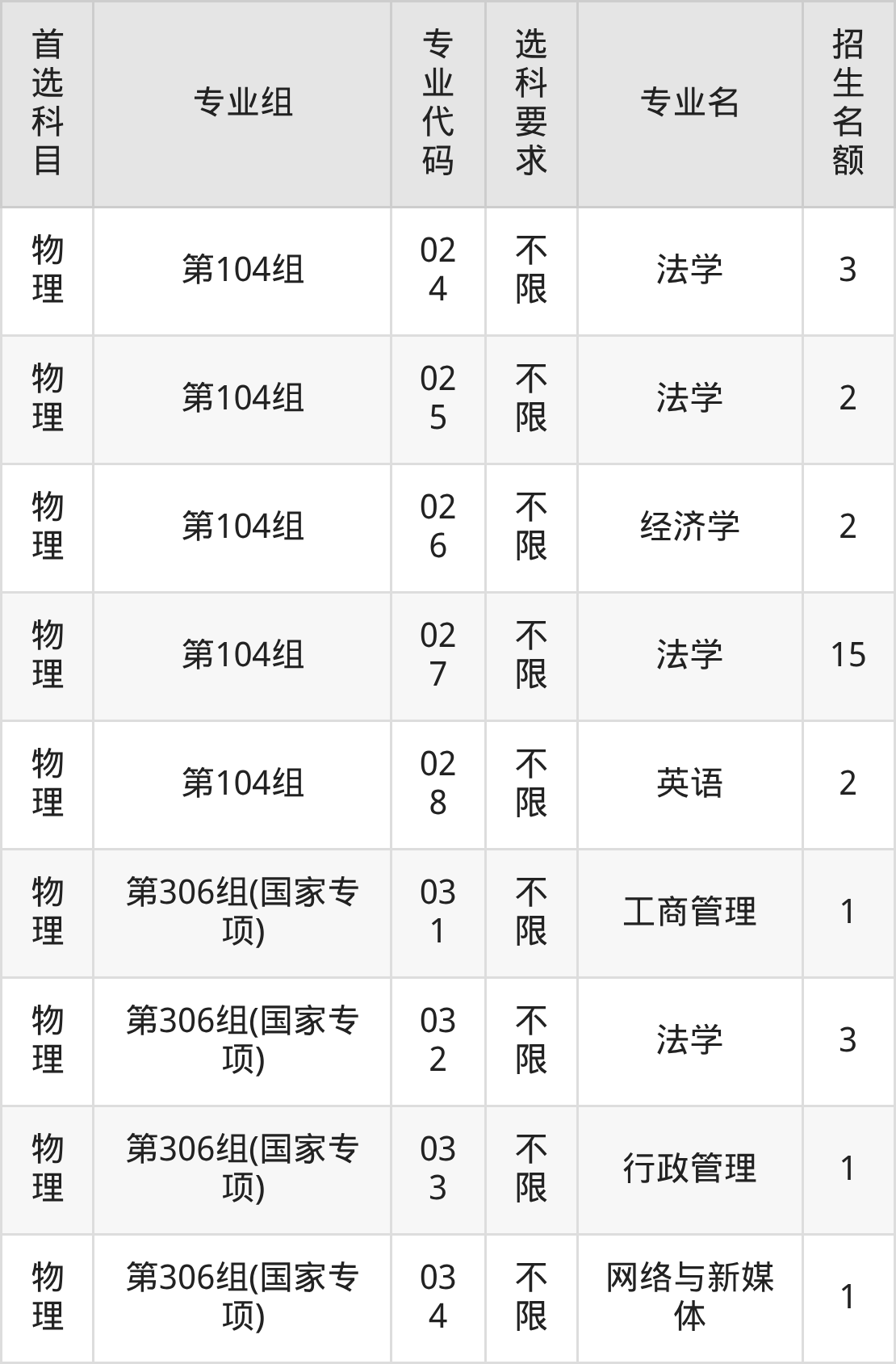 各专业选科要求、招生名额汇总如下: