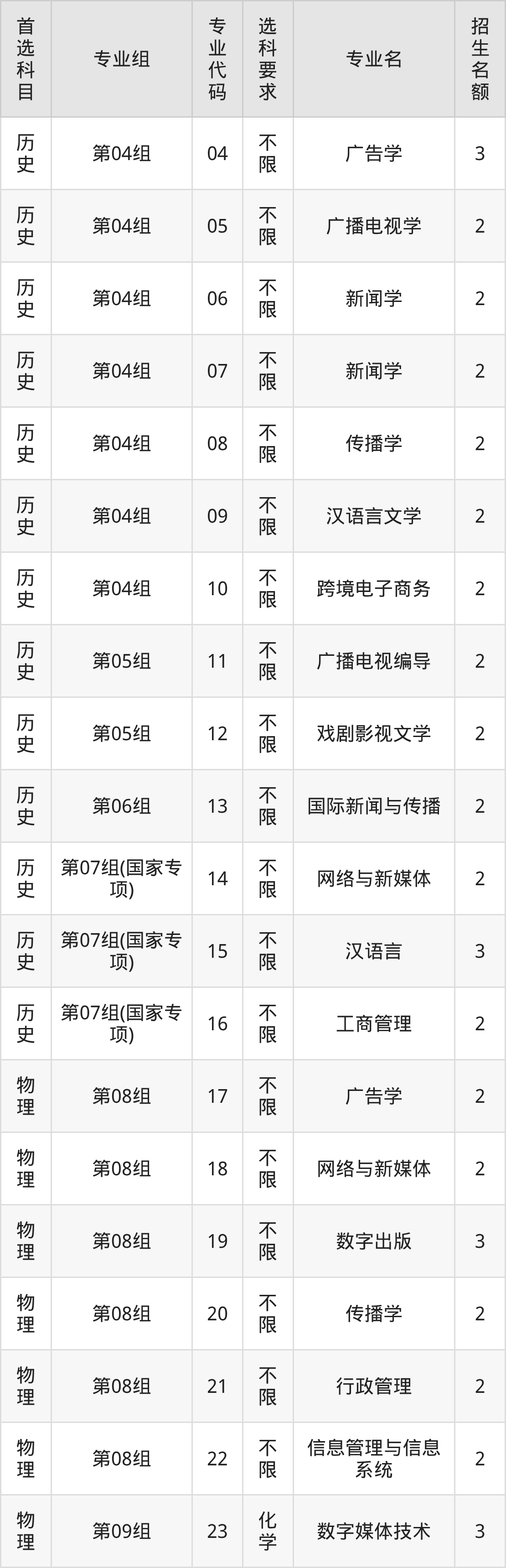 2025年中国传媒大学在湖北省本科批招生中,总计划人数为83人,招生专业有25个,包括广告学(5人)、广播电视学(2人)、新闻学(4人)、传播学(4人)等。其中数字媒体技术、智能科学与技术为中外合作办学,学费均是100000元/年。