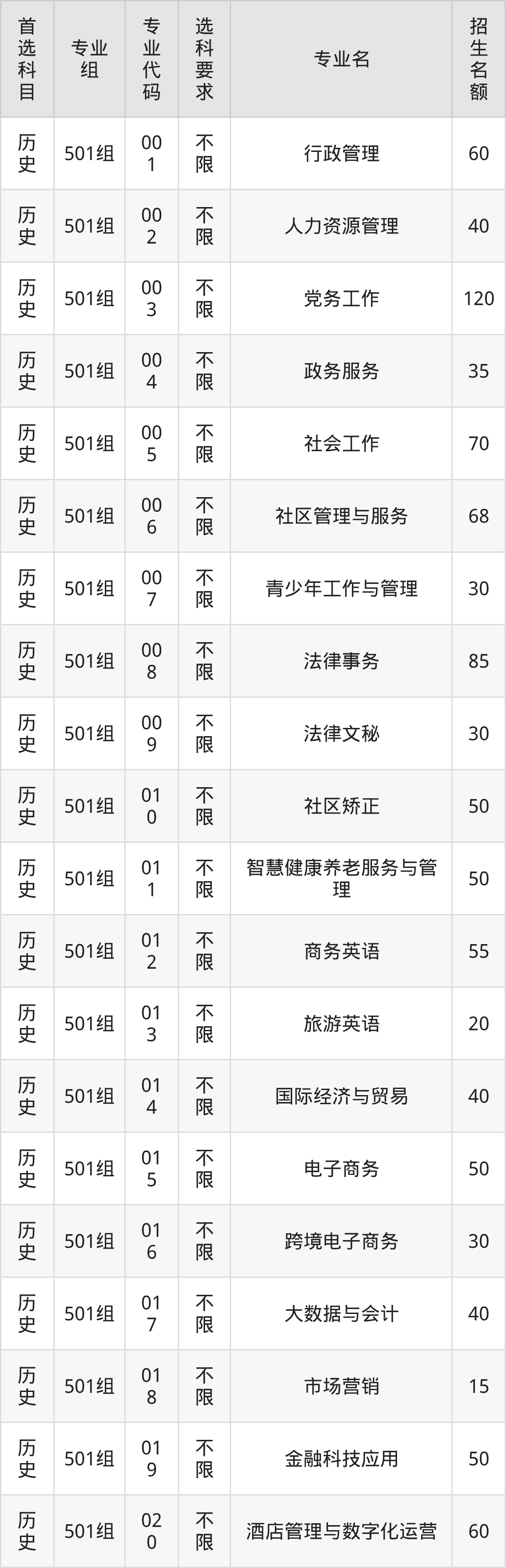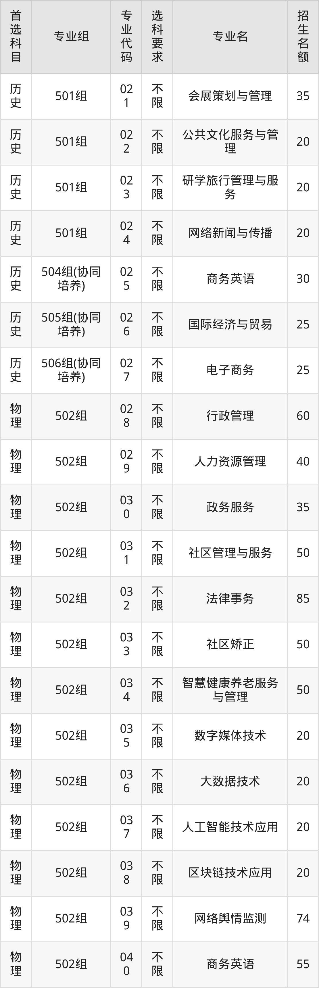 2025年广东行政职业学院在广东省专科高职批招生中,总计划人数为2202人,招生专业有35个,包括行政管理(120人)、人力资源管理(80人)、党务工作(120人)、政务服务(70人)等。