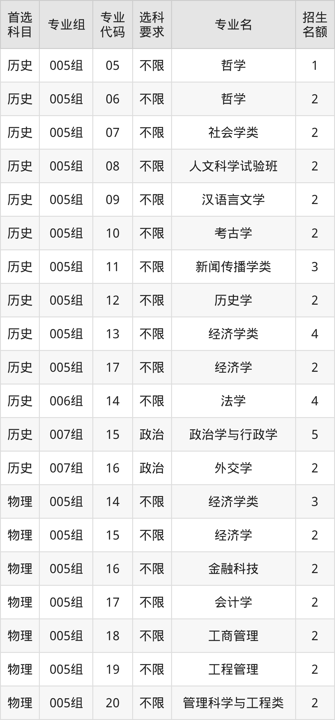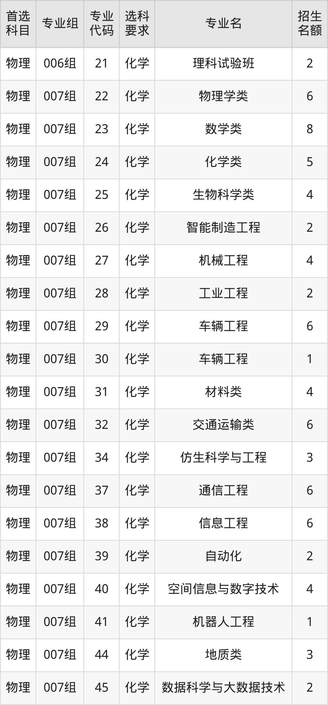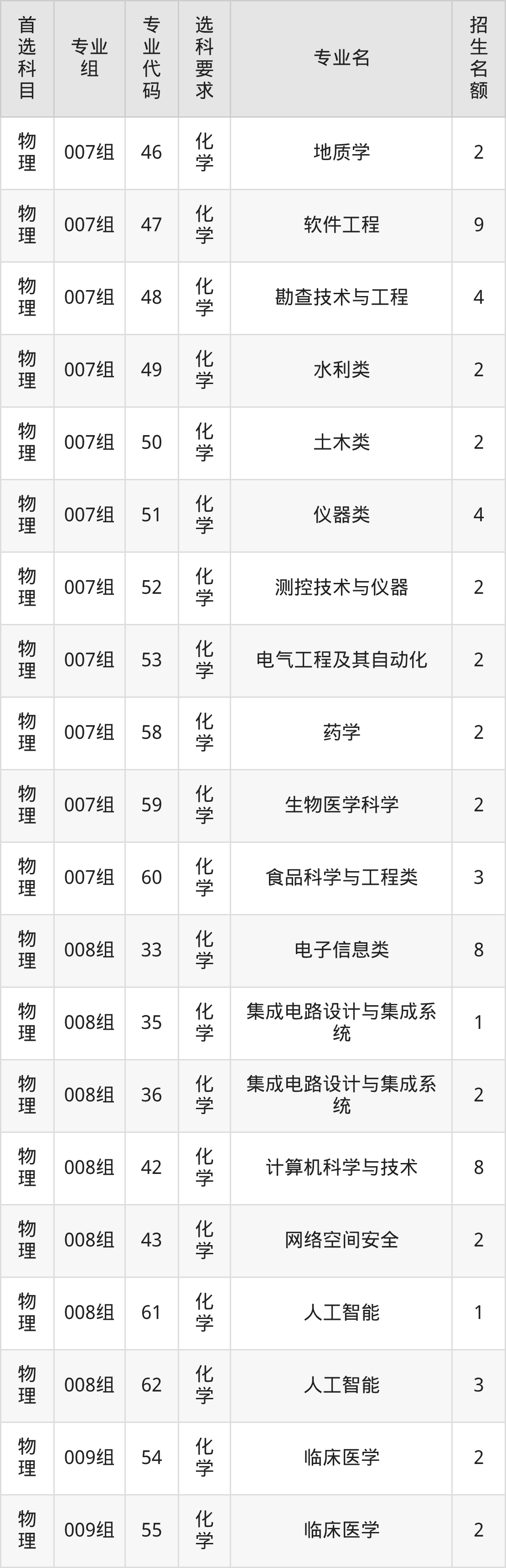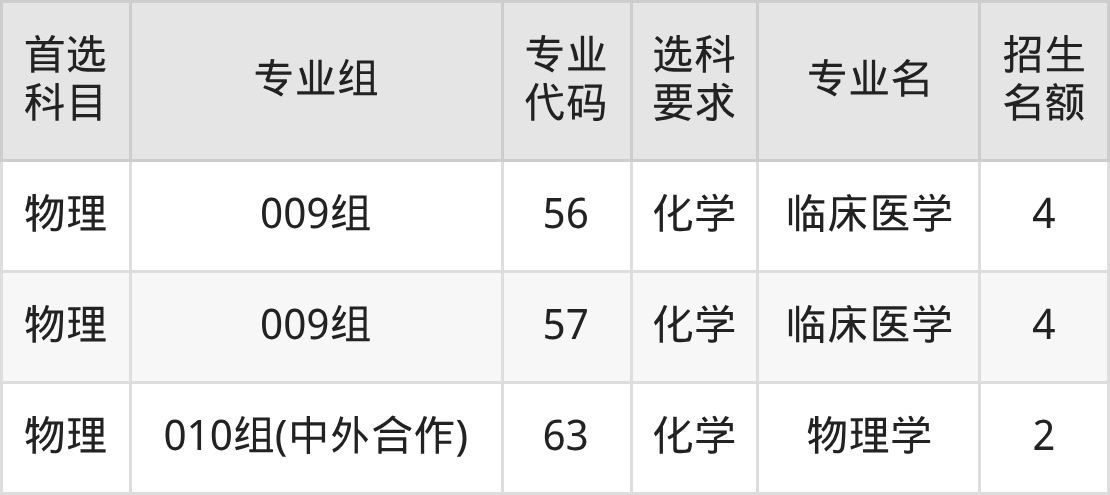 各专业选科要求、招生名额汇总如下: