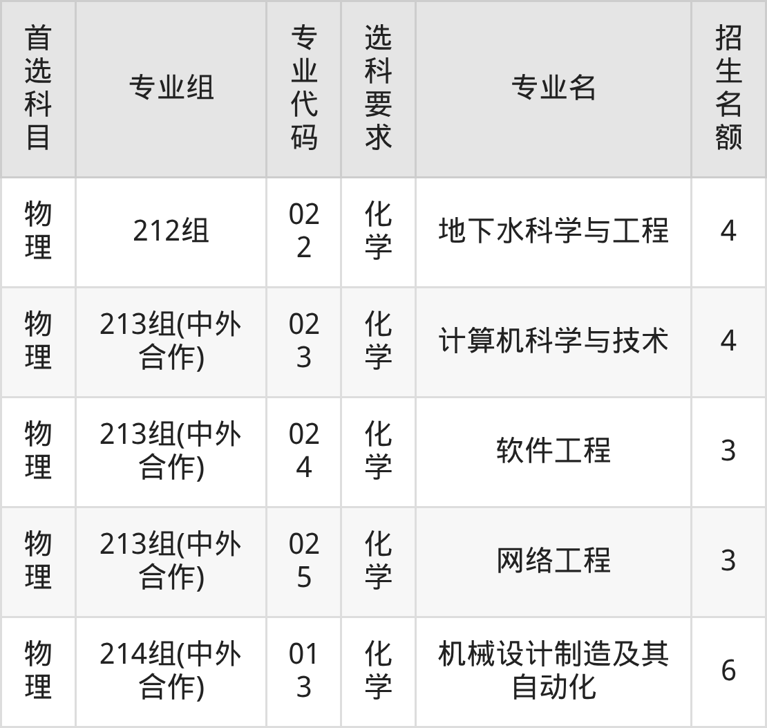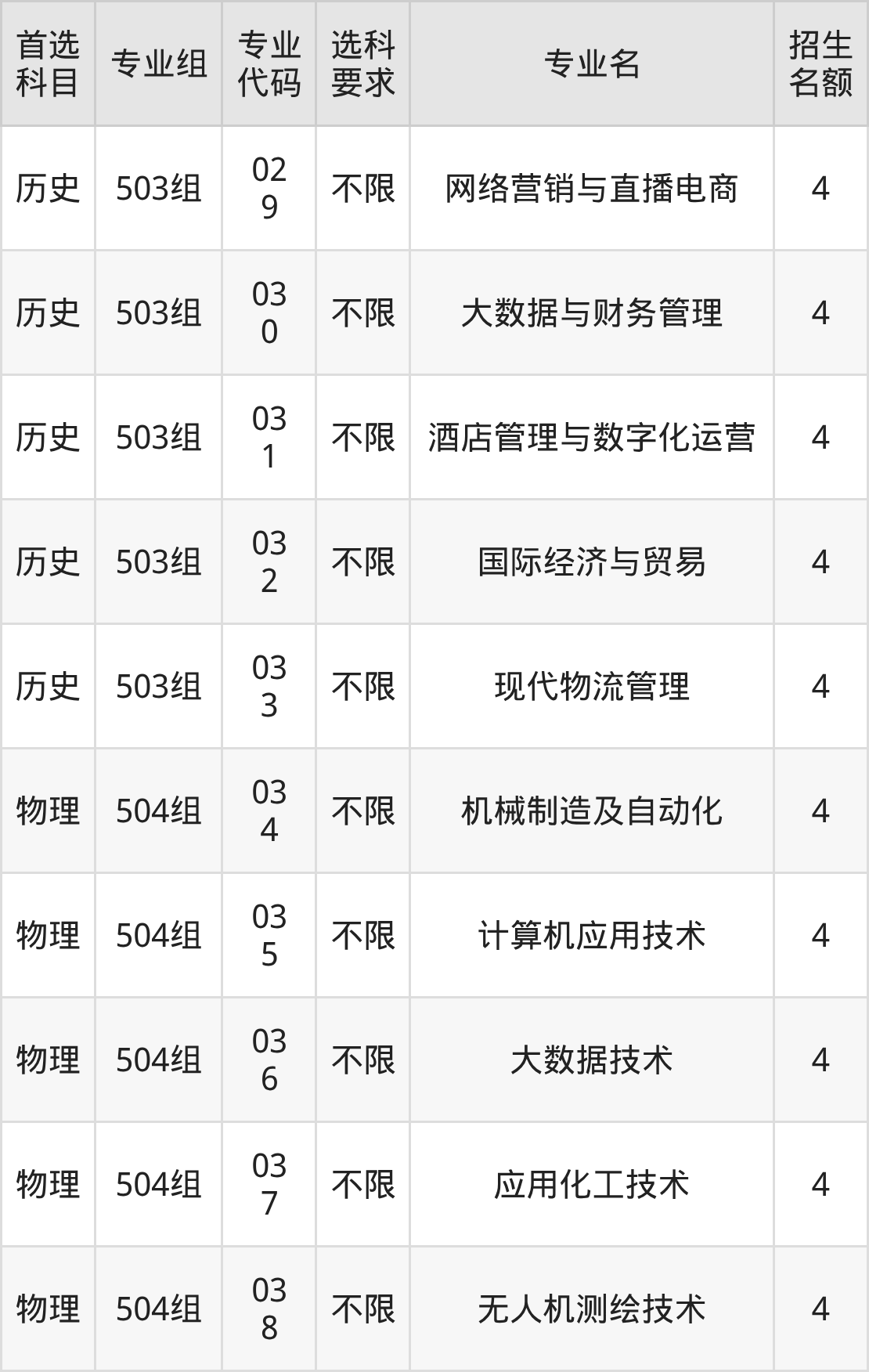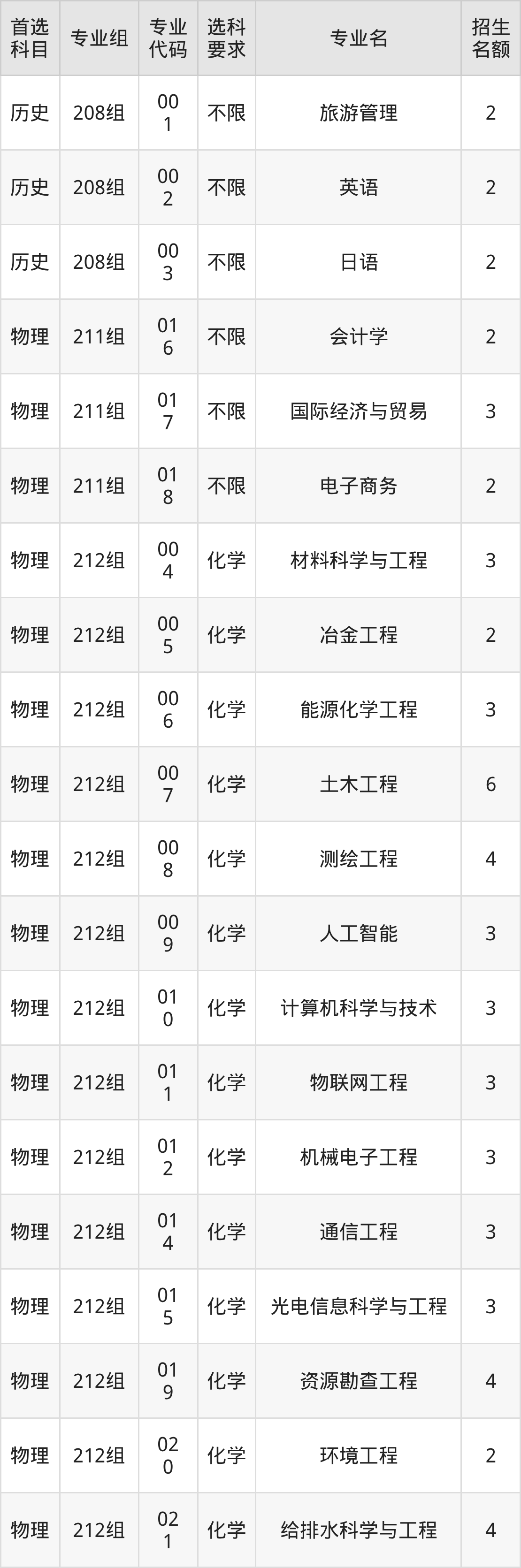 各专业选科要求、招生名额汇总如下: