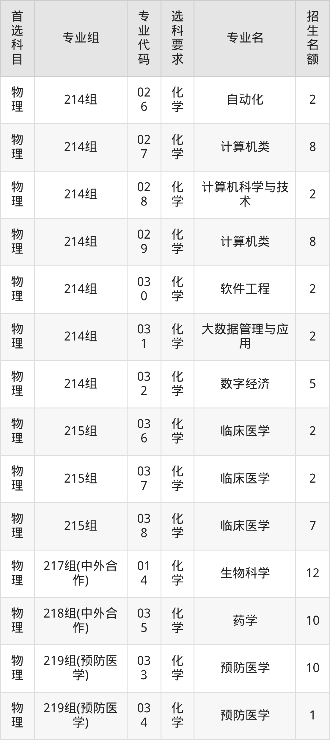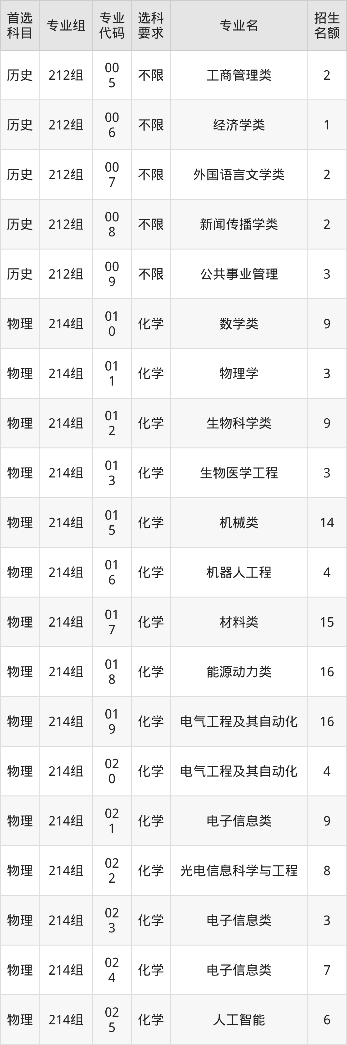 各专业选科要求、招生名额汇总如下: