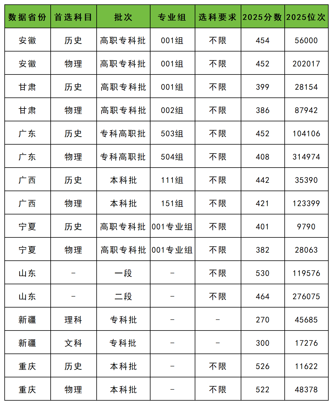 本科批(仅重庆、山东、广西等少数省份招生)稳中有升,物理类约430–530分,历史类约450–530分;专科批各省(区、市)差异显著,整体较2025年微涨0–5分。