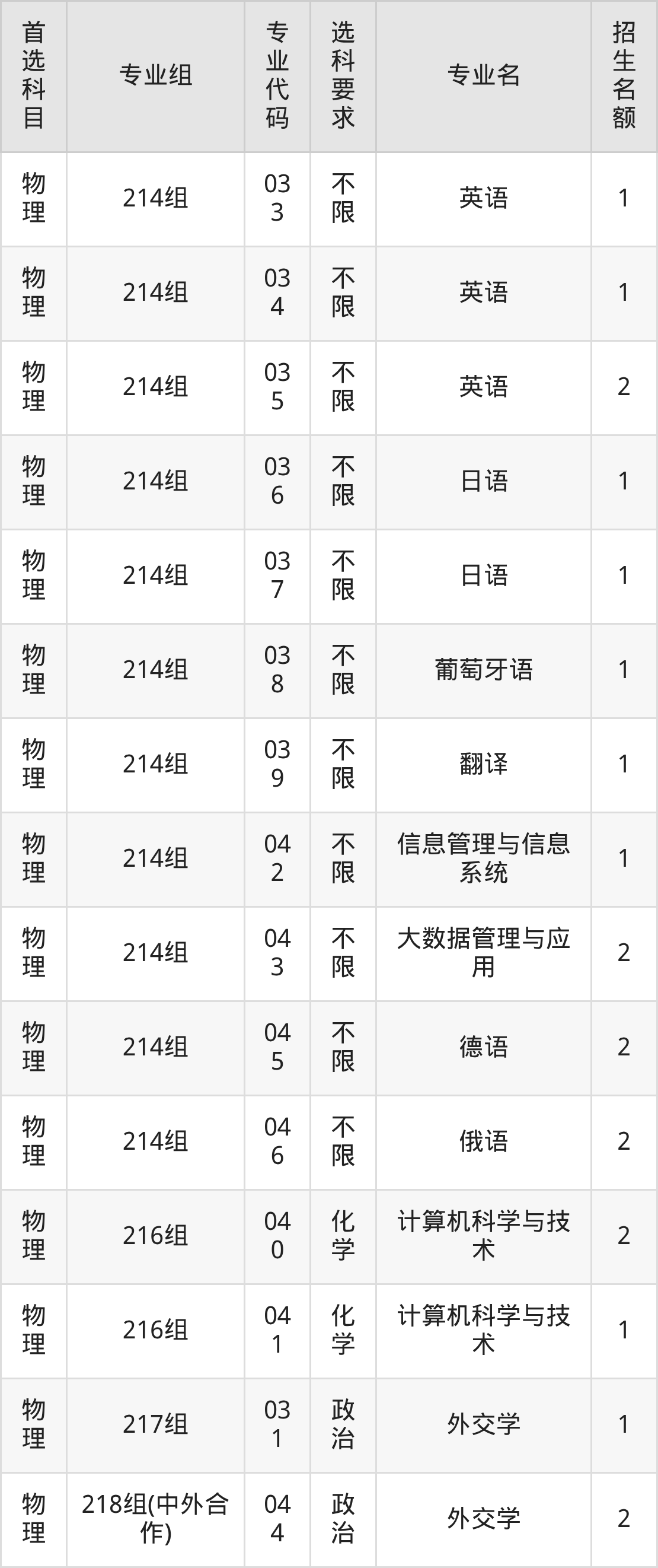 各专业选科要求、招生名额汇总如下: