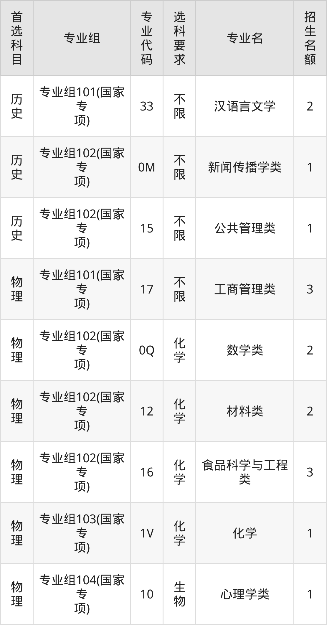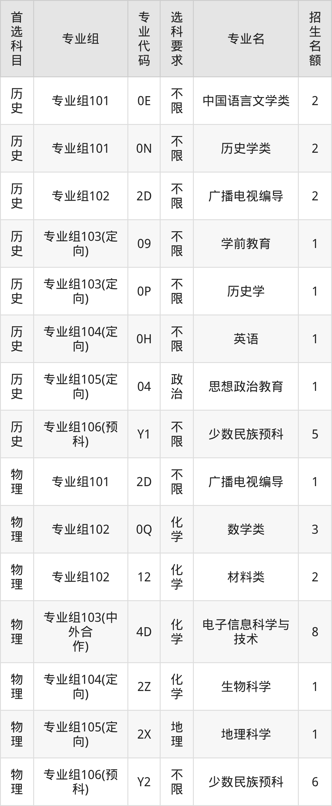 各专业选科要求、招生名额汇总如下: