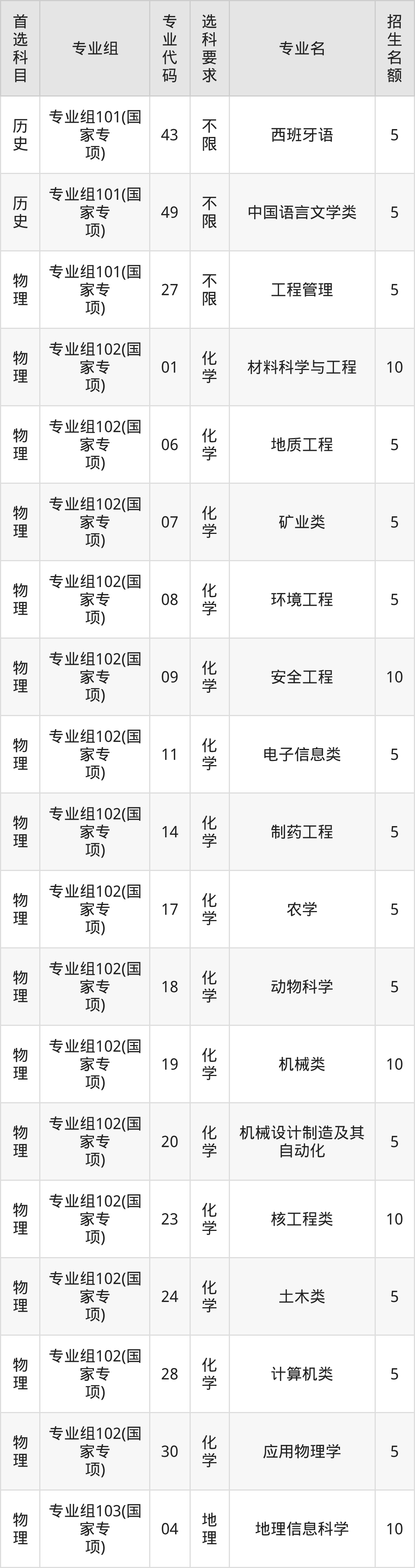 2025年西南科技大学在四川省本科批A段(国家专项)招生中,总计划人数为120人,招生专业有19个,包括西班牙语(5人)、中国语言文学类(5人)、工程管理(5人)、材料科学与工程(10人)等。