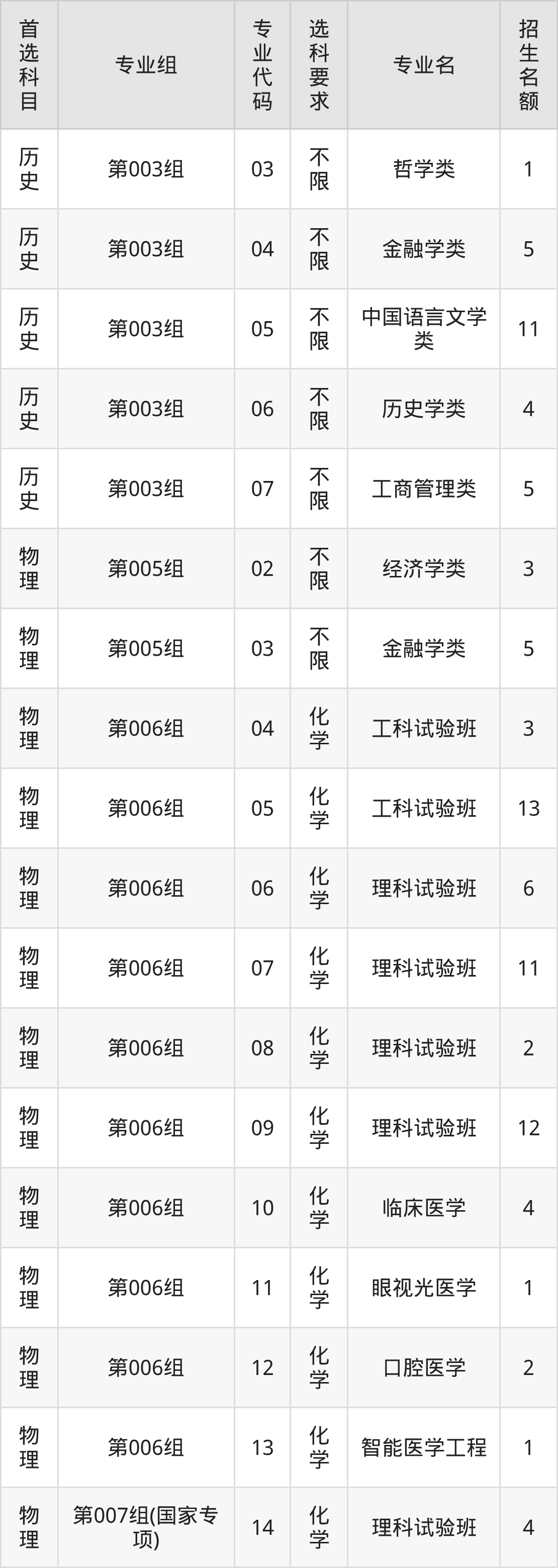 各专业选科要求、招生名额汇总如下: