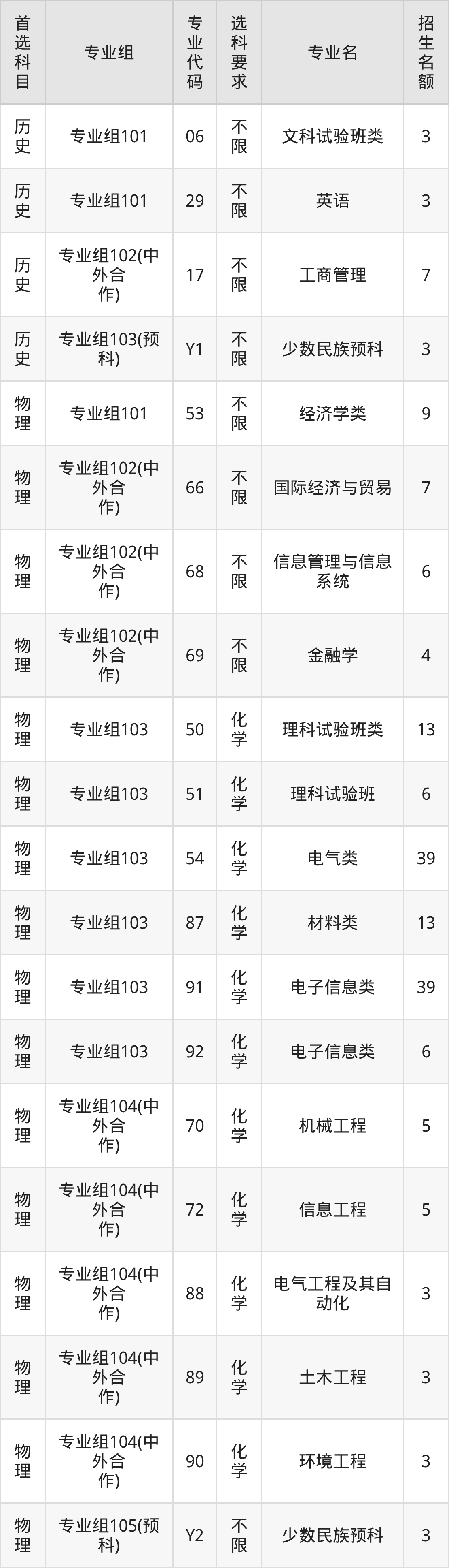 各专业选科要求、招生名额汇总如下: