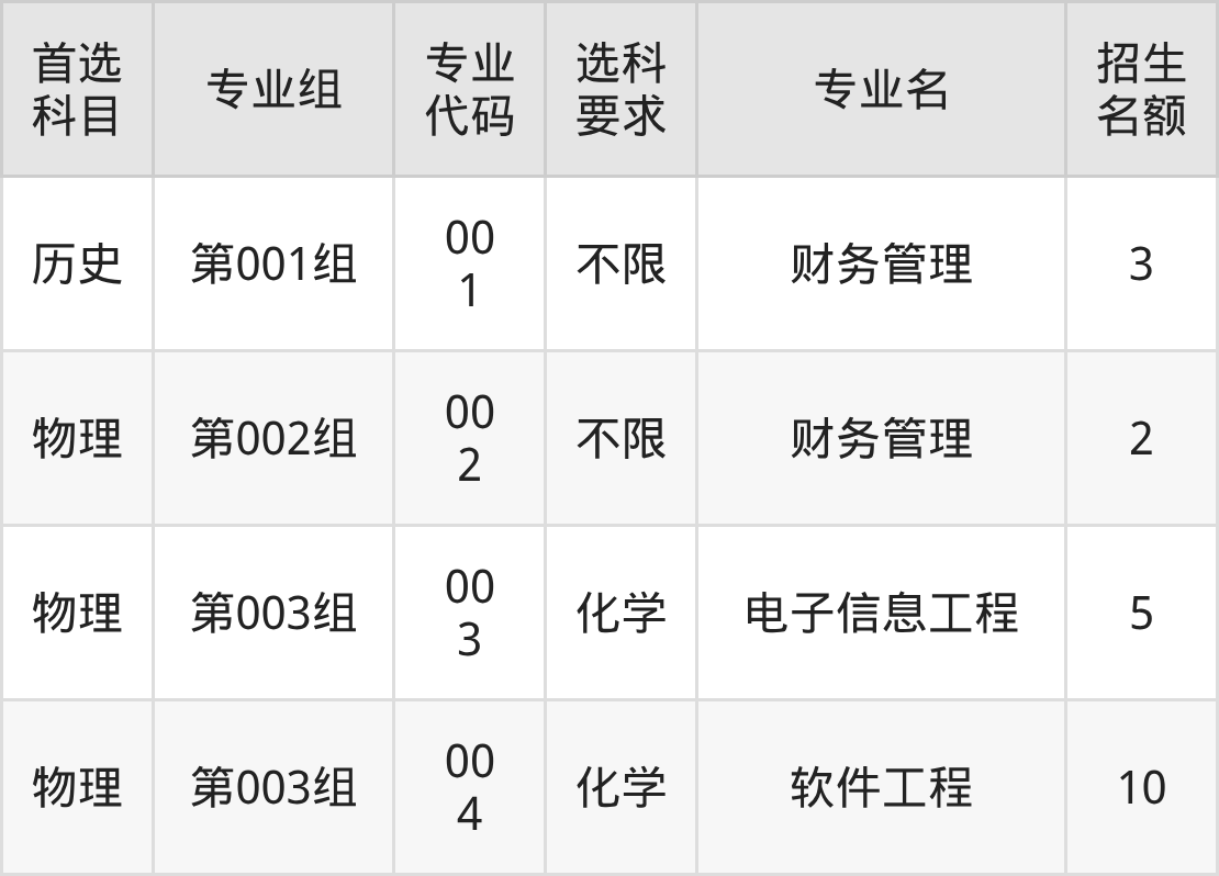 各专业选科要求、招生名额汇总如下: