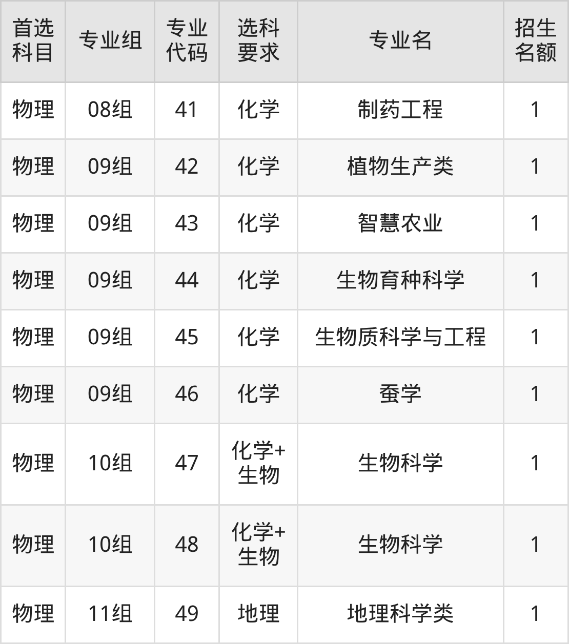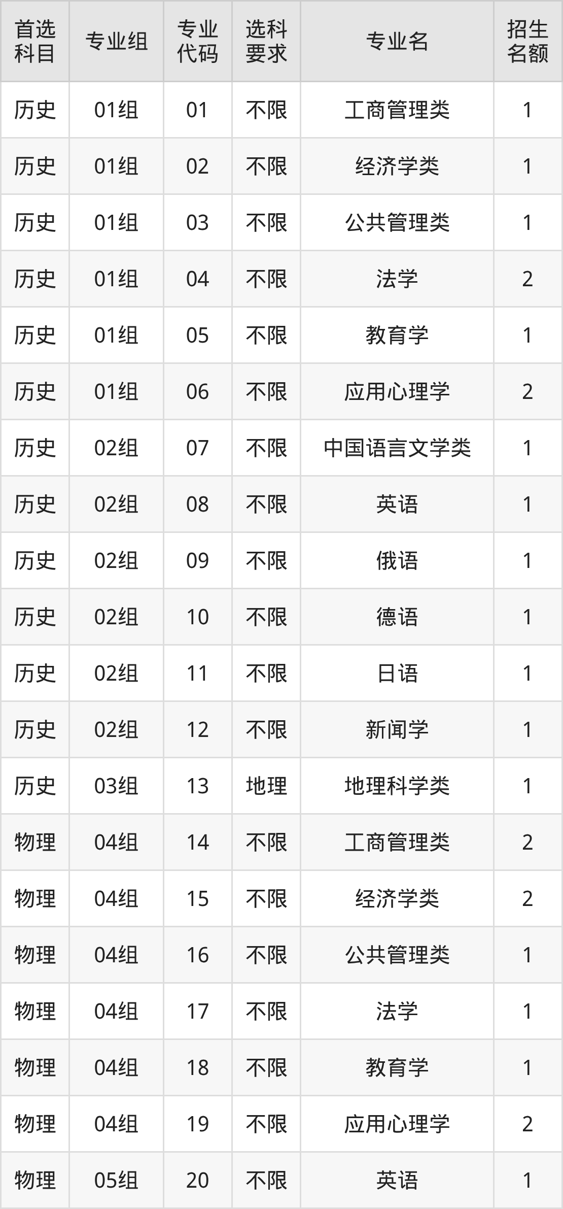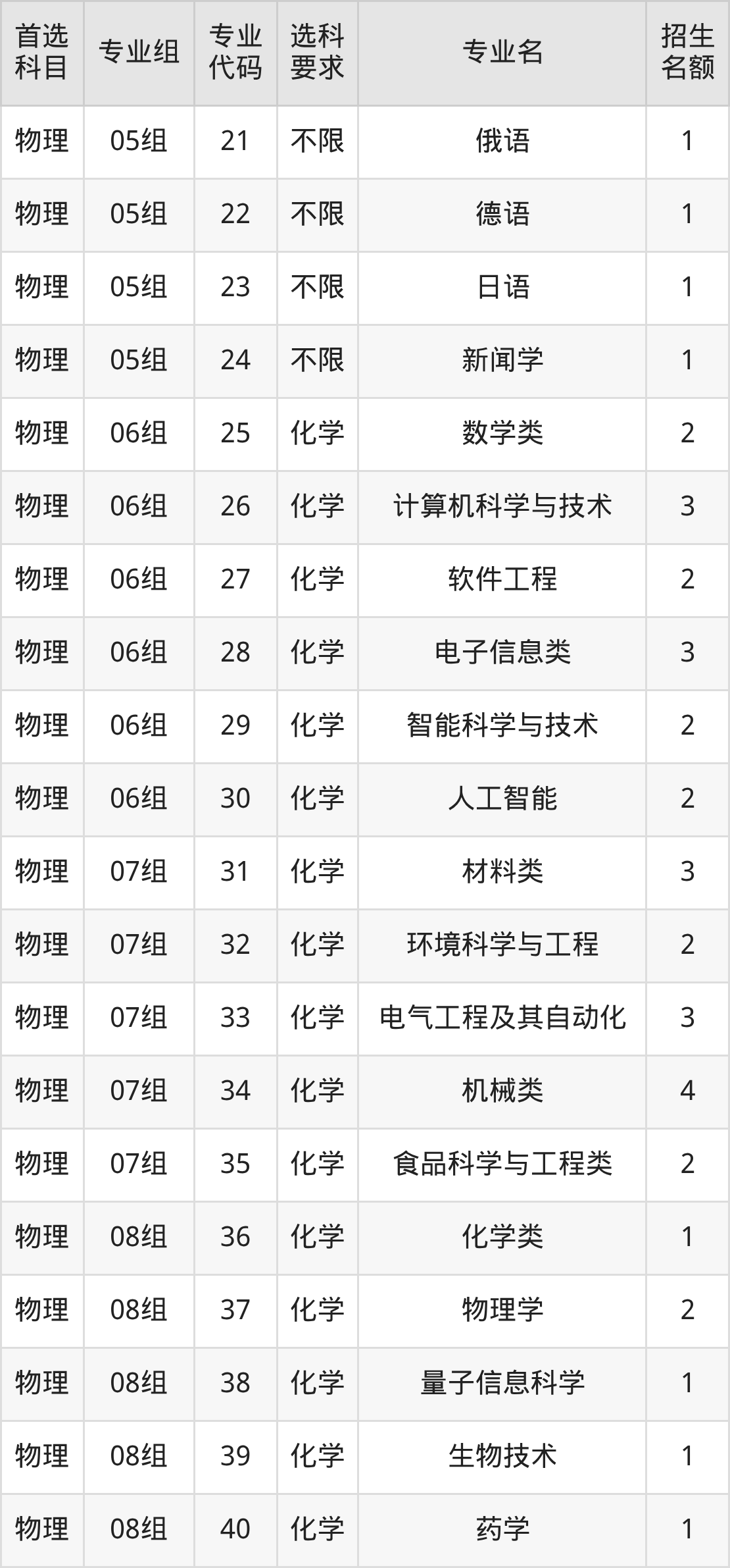 各专业选科要求、招生名额汇总如下: