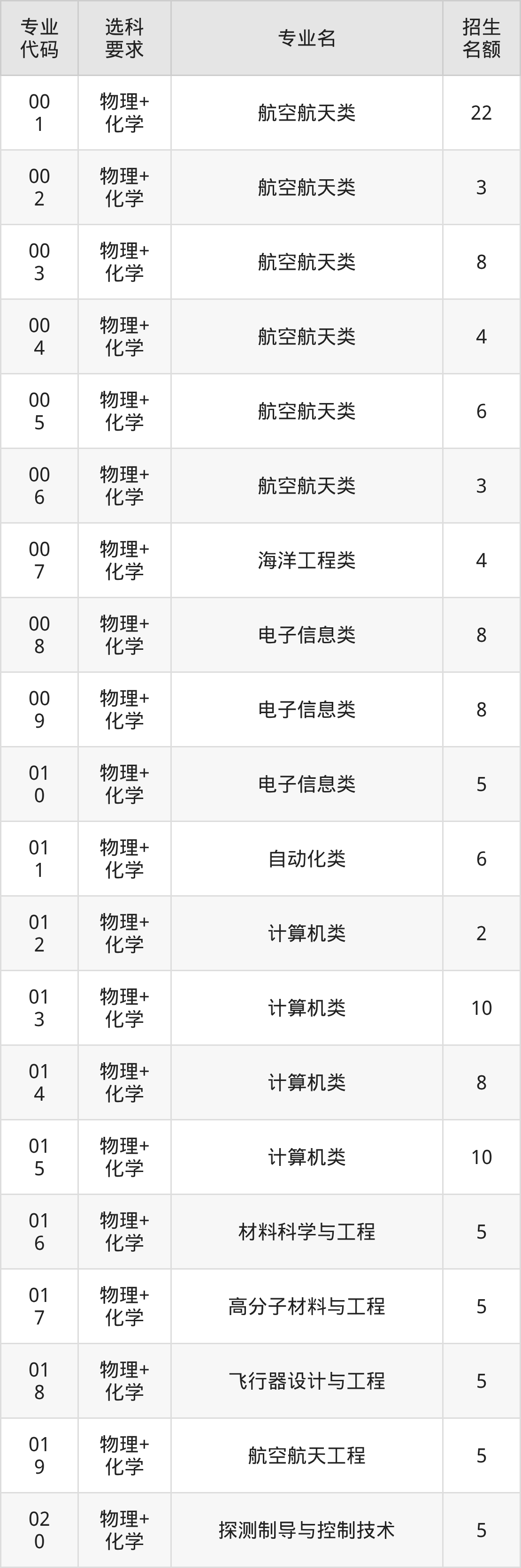 各专业选科要求、招生名额汇总如下: