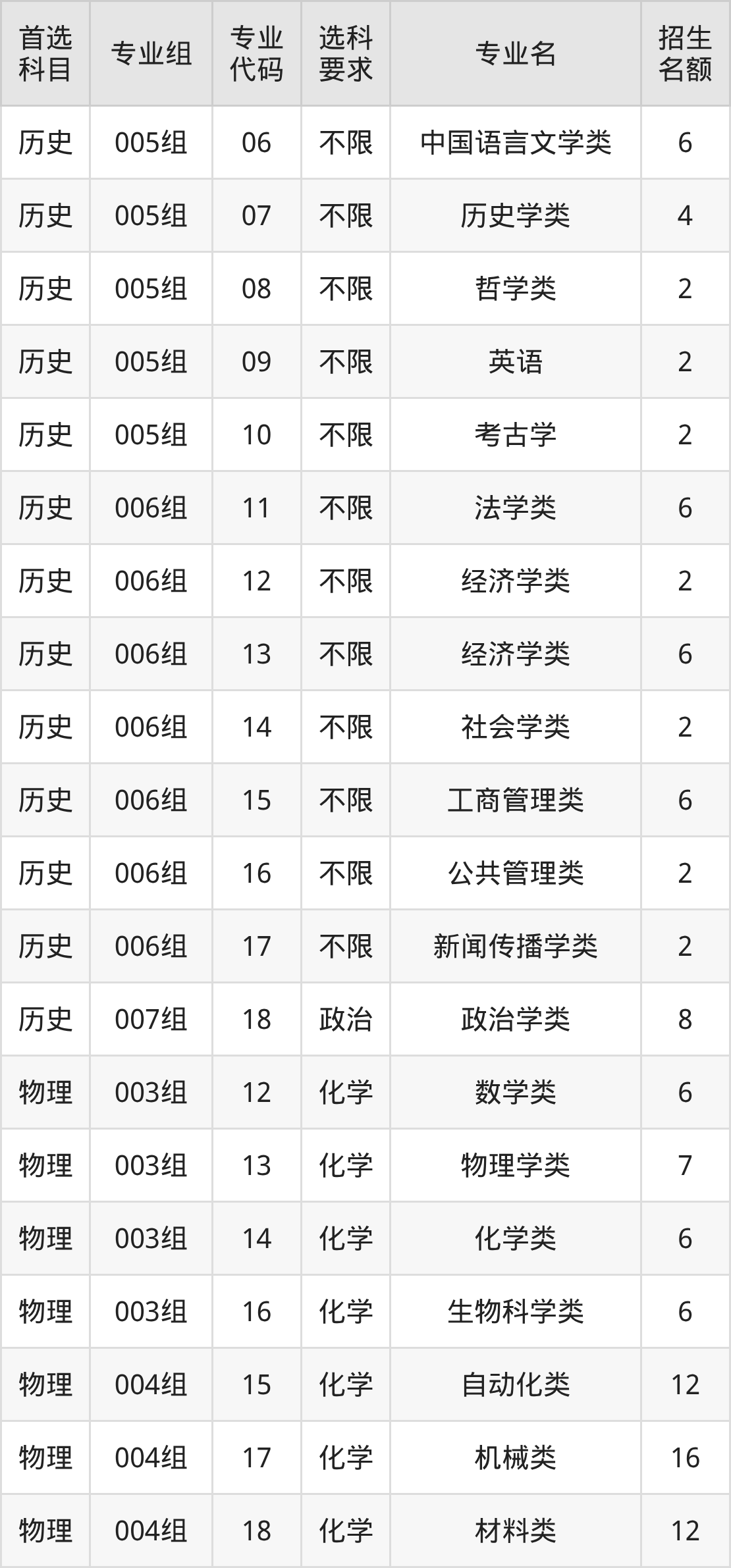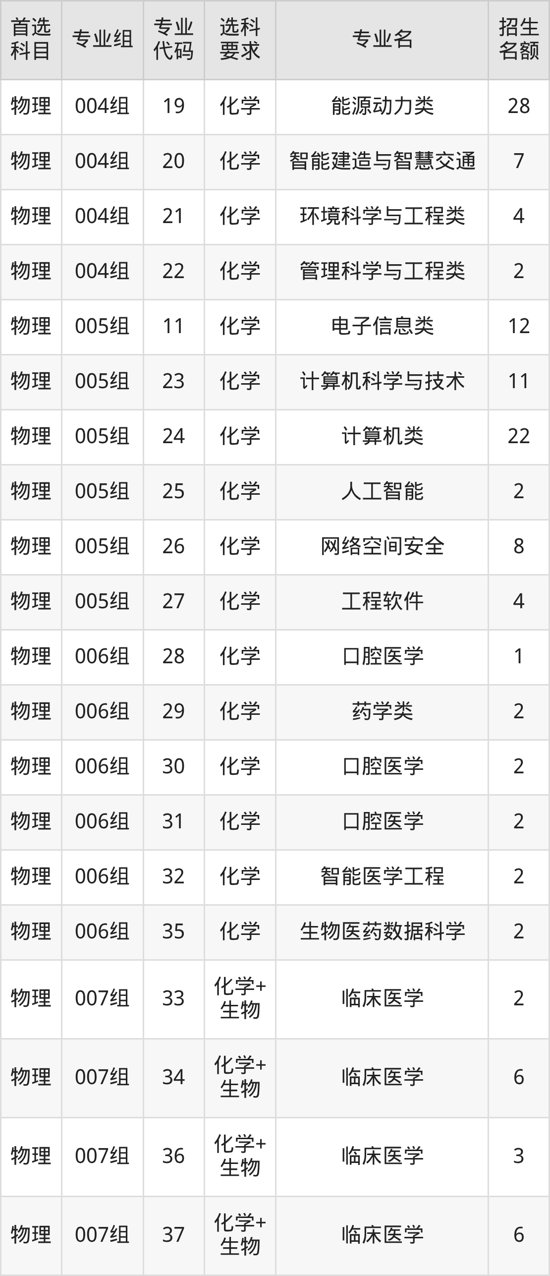 各专业选科要求、招生名额汇总如下: