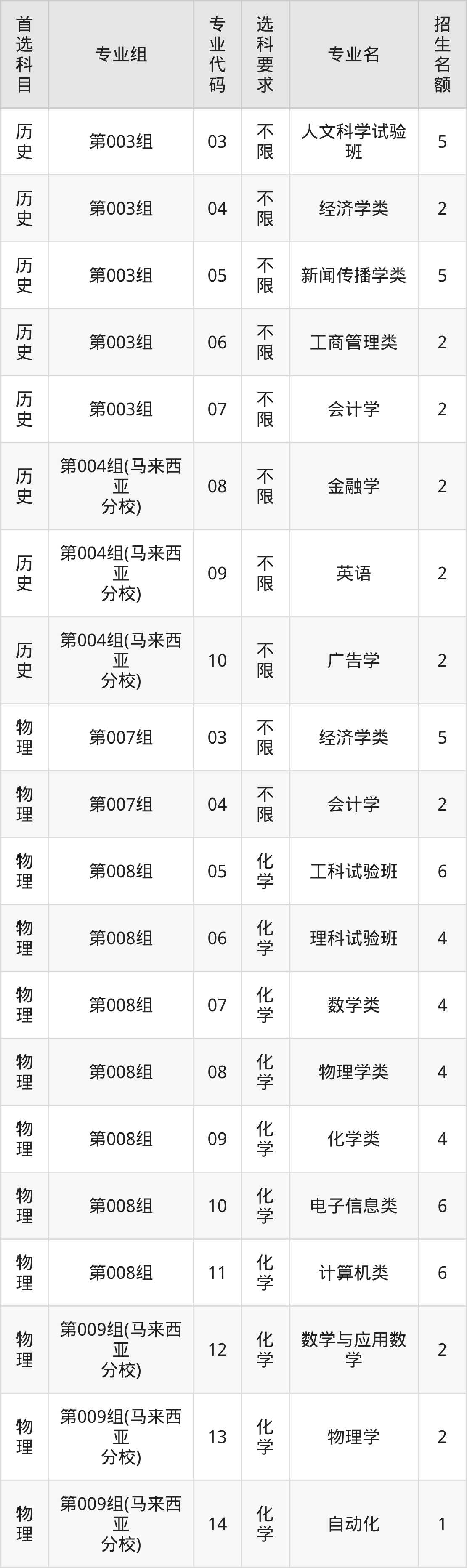 各专业选科要求、招生名额汇总如下: