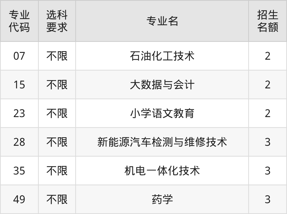 2025年广西工业职业技术学院在山东省二段招生中,总计划人数为15人,招生专业有6个,包括石油化工技术(2人)、大数据与会计(2人)、小学语文教育(2人)、新能源汽车检测与维修技术(3人)等。