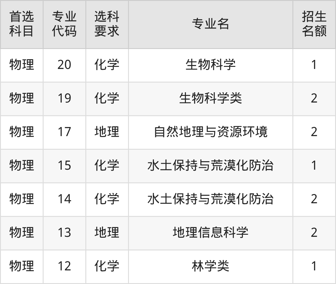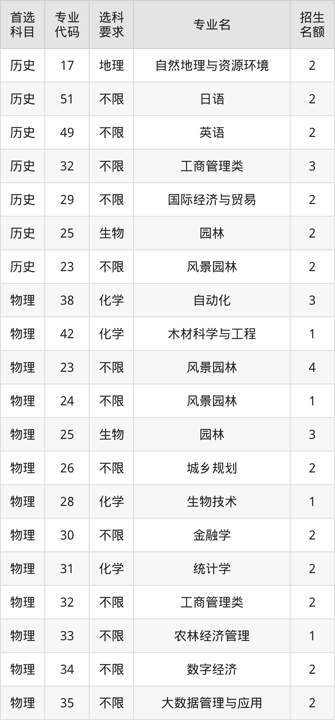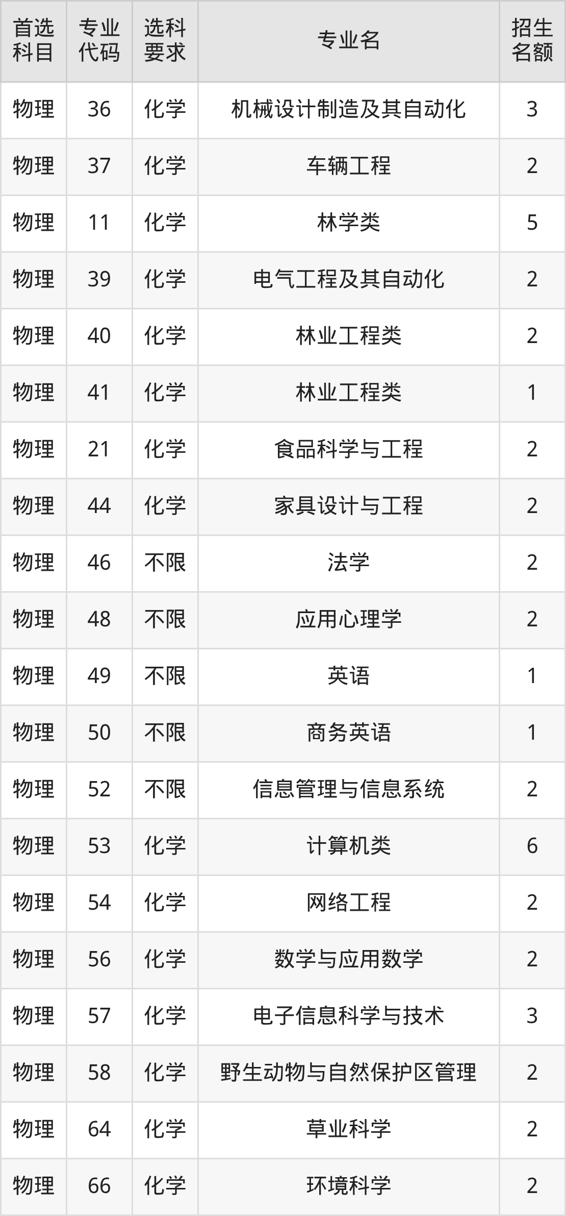 2025年北京林业大学在辽宁省本科批招生中,总计划人数为98人,招生专业有38个,包括自然地理与资源环境(4人)、日语(2人)、英语(3人)、工商管理类(5人)等。