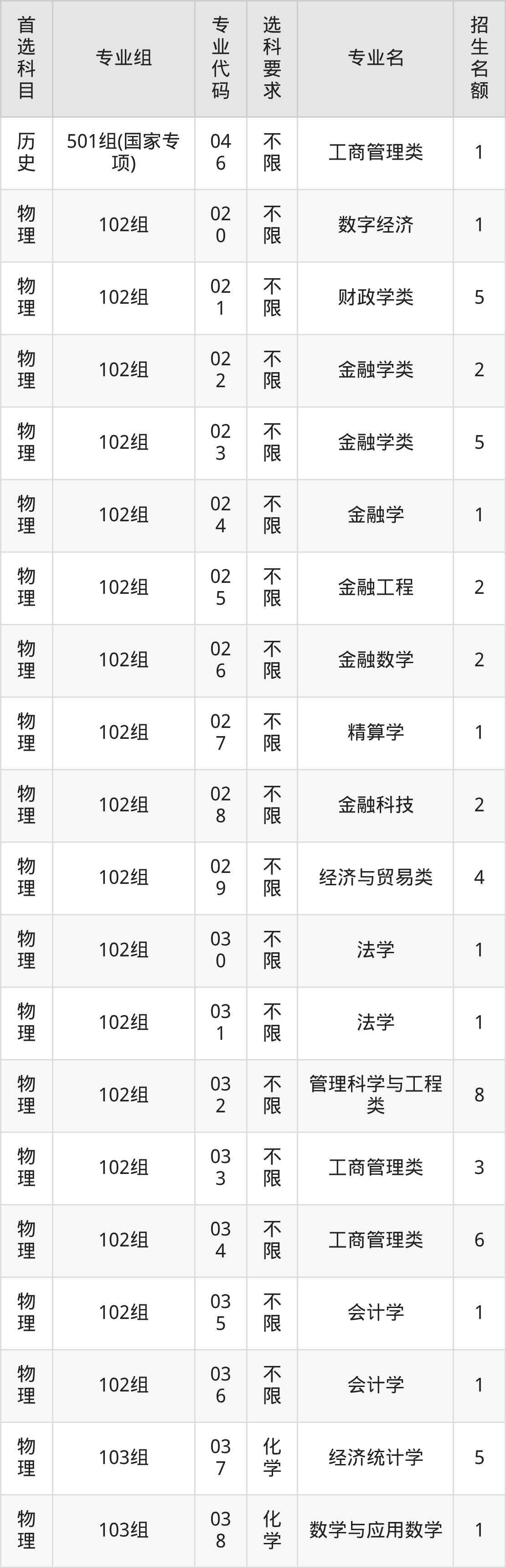 2025年西南财经大学在广西壮族自治区本科批招生中,总计划人数为117人,招生专业有23个,包括财政学类(12人)、金融学类(16人)、金融学(2人)、经济与贸易类(8人)等。