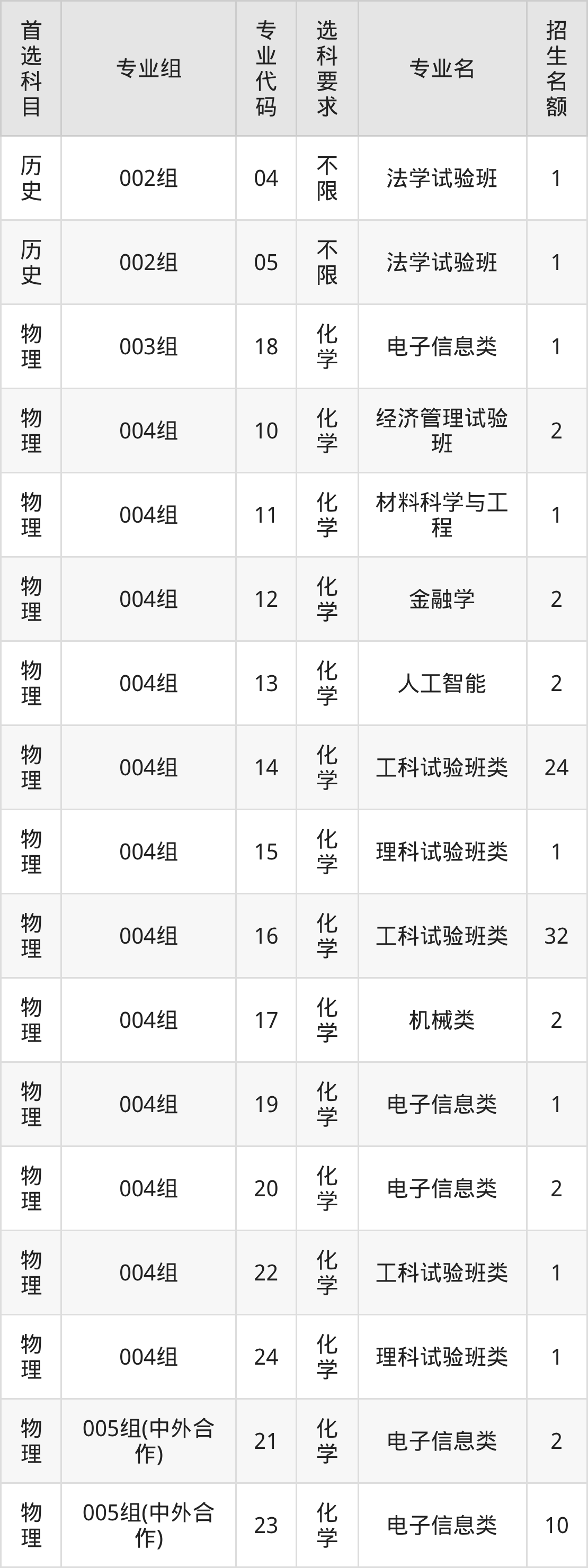 各专业选科要求、招生名额汇总如下: