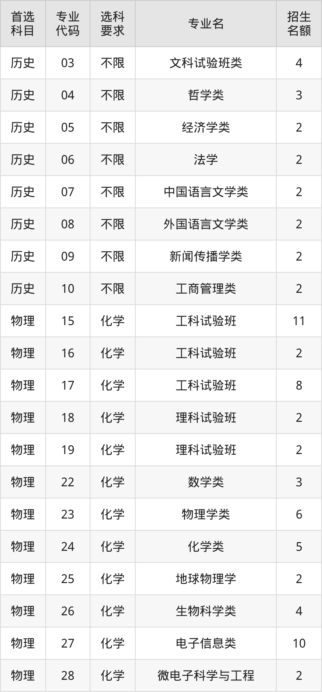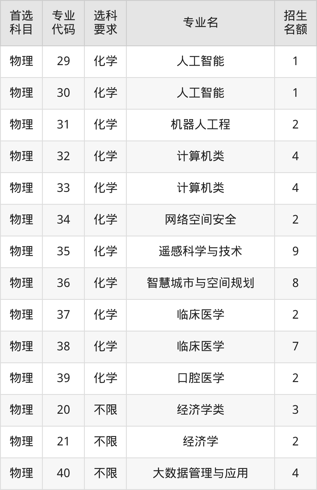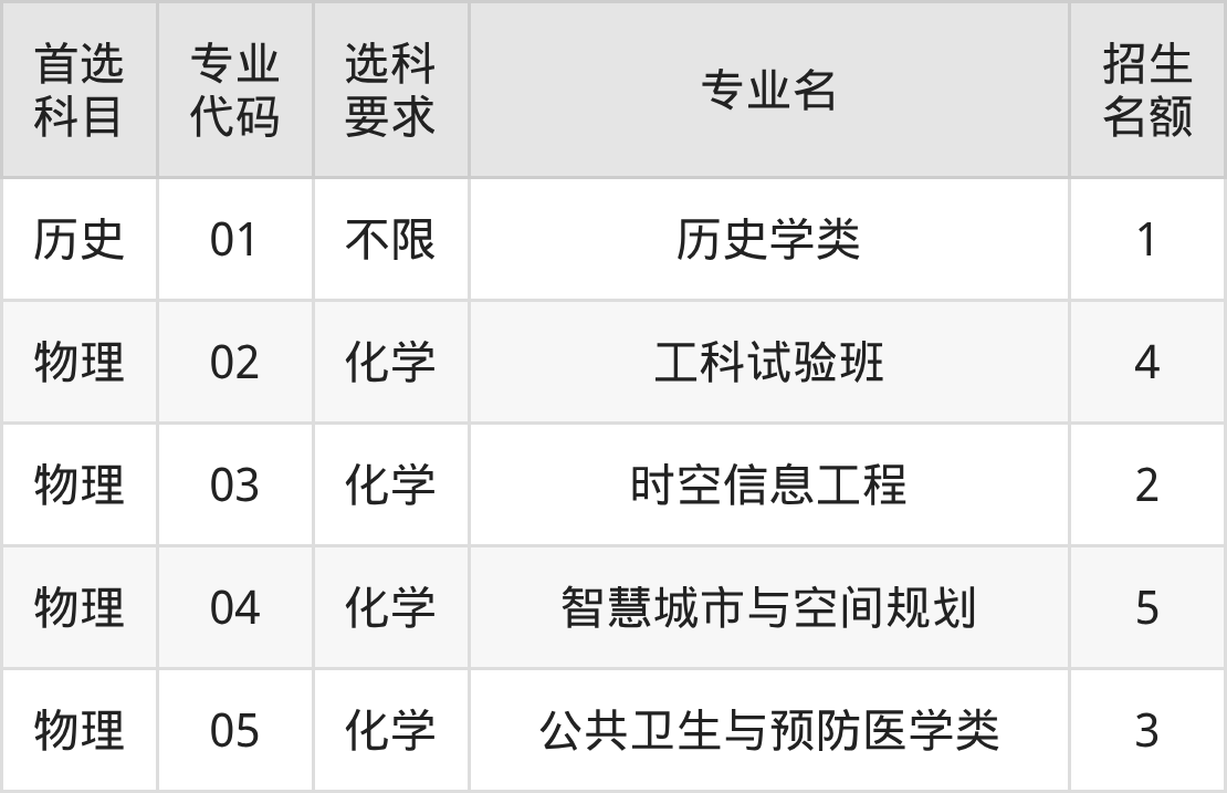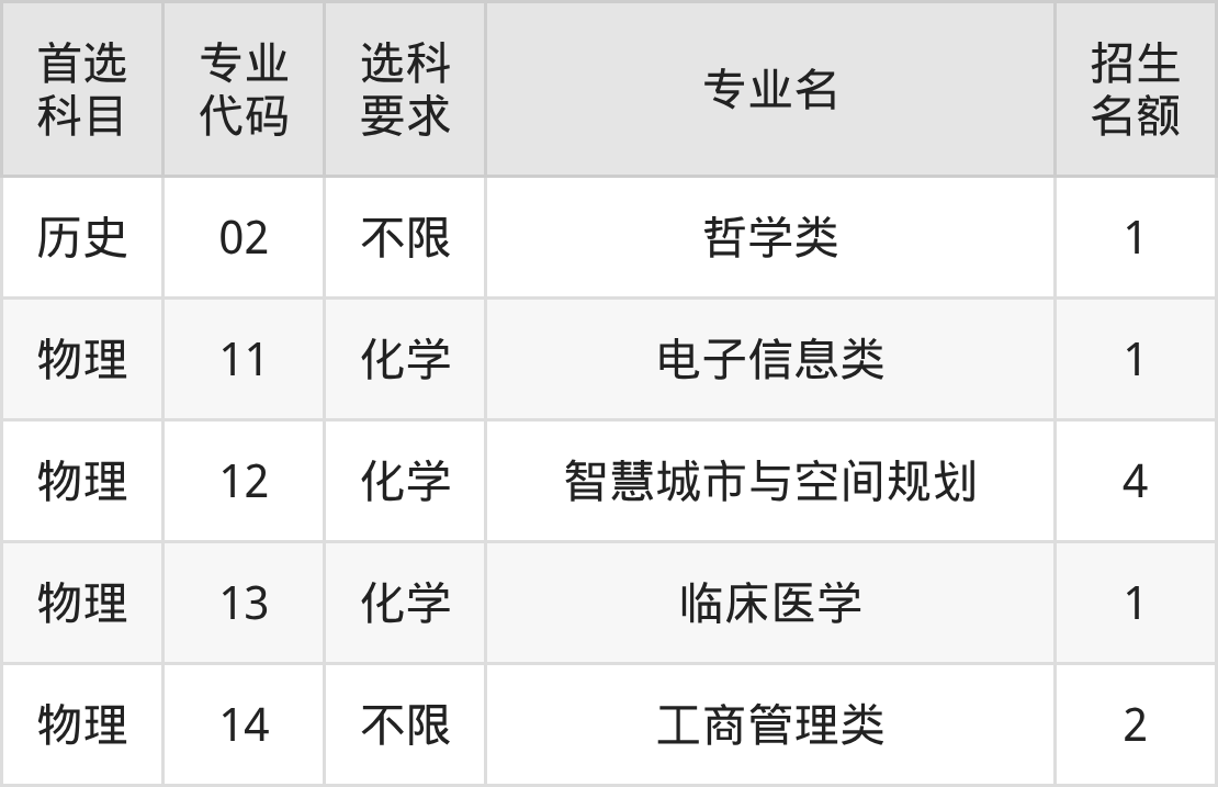 各专业选科要求、招生名额汇总如下: