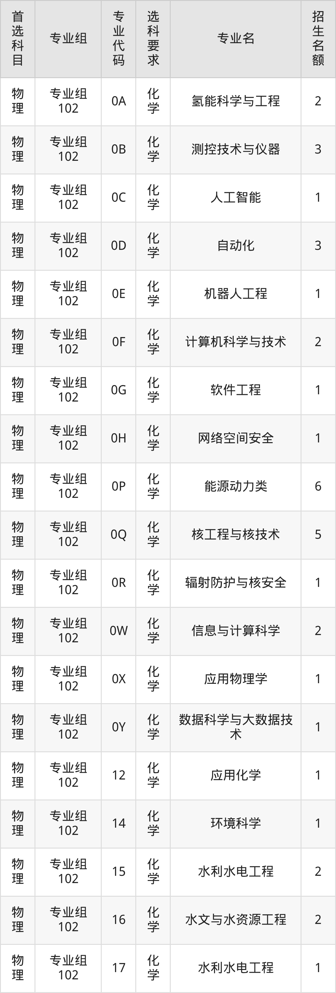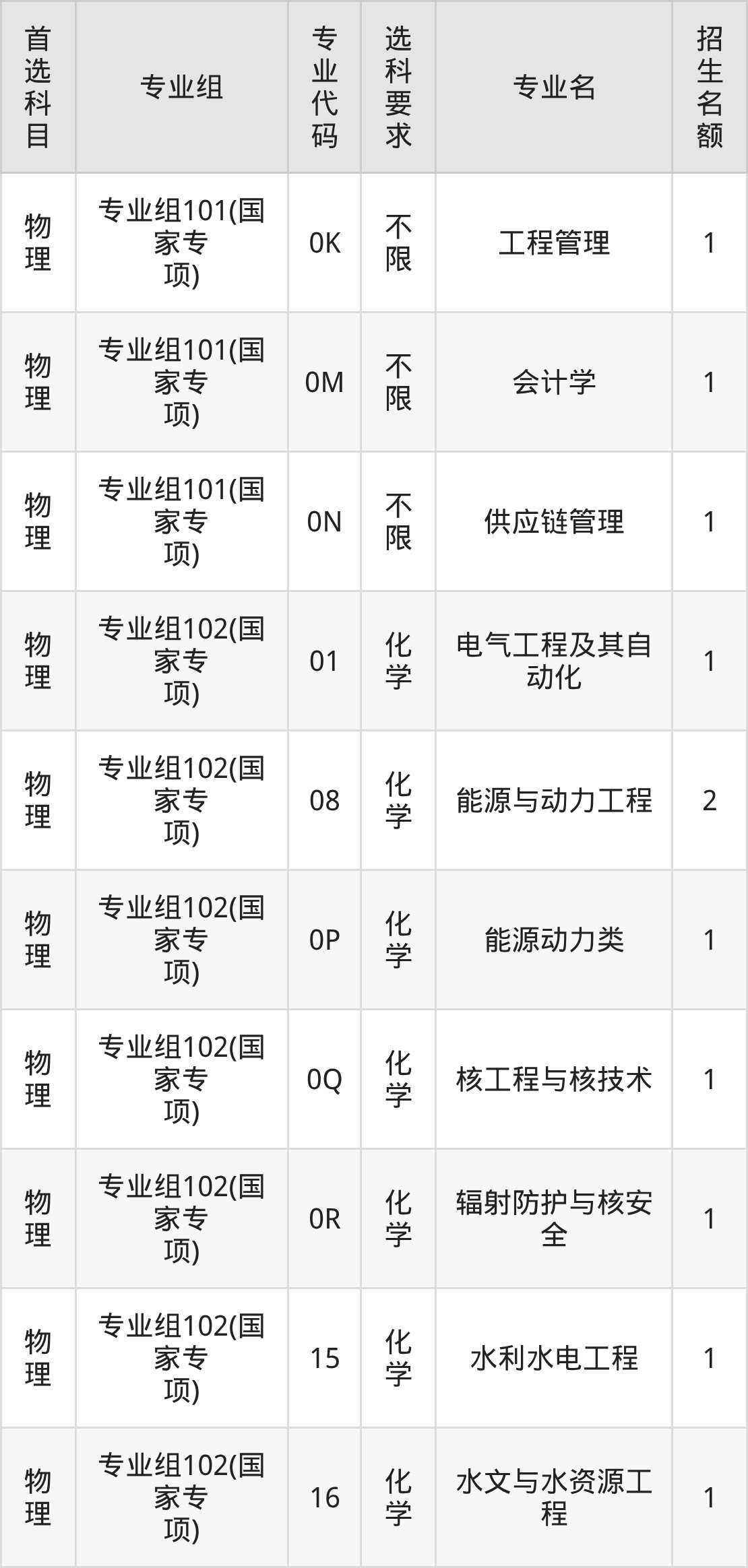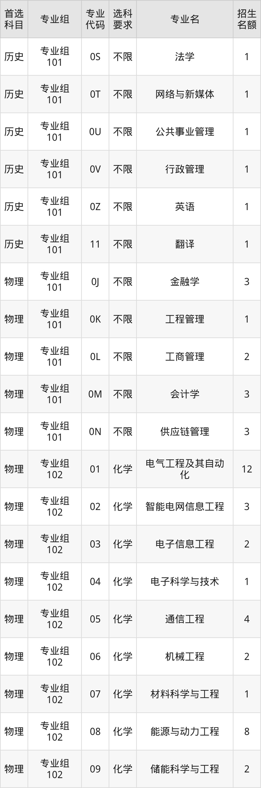 各专业选科要求、招生名额汇总如下: