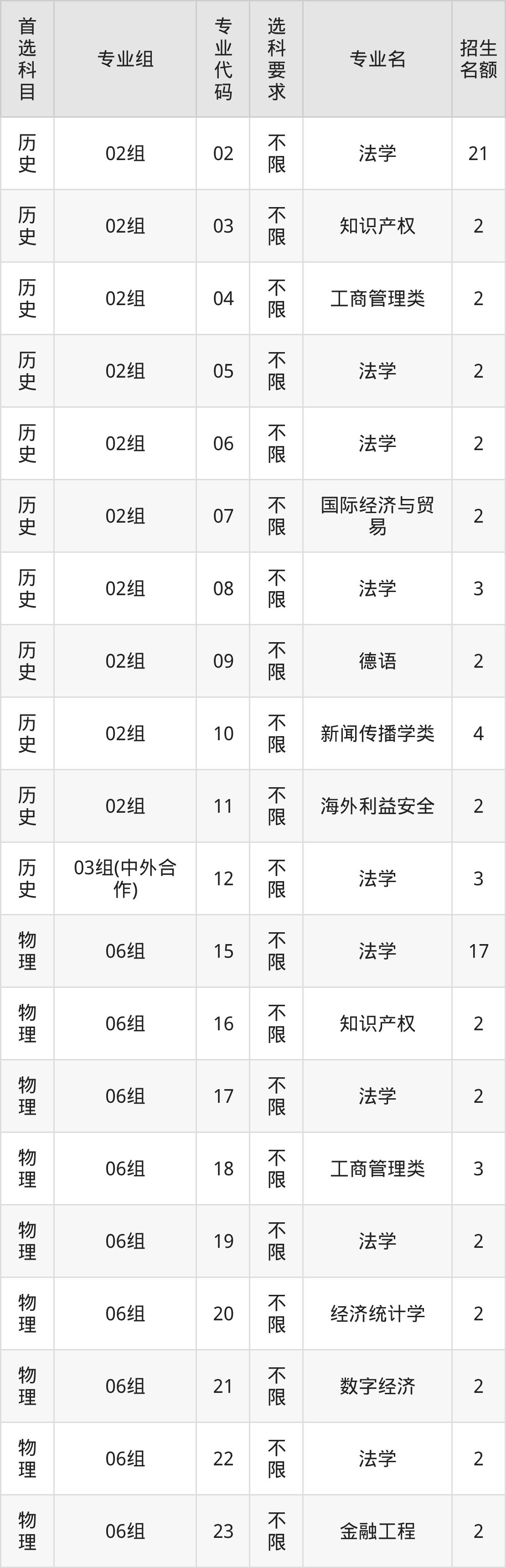 各专业选科要求、招生名额汇总如下: