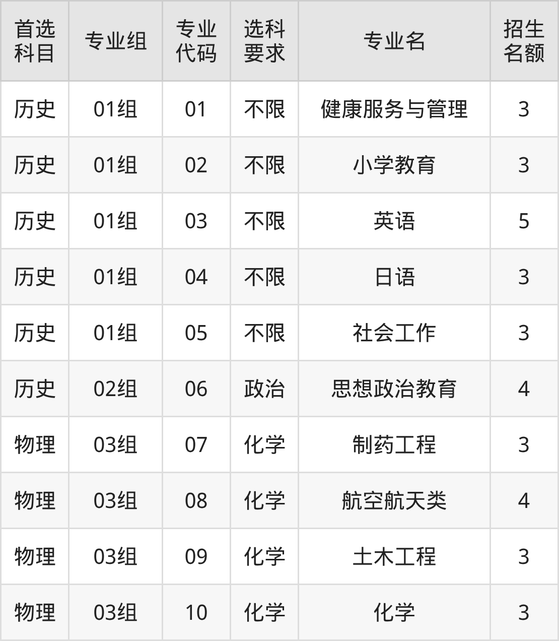各专业选科要求、招生名额汇总如下: