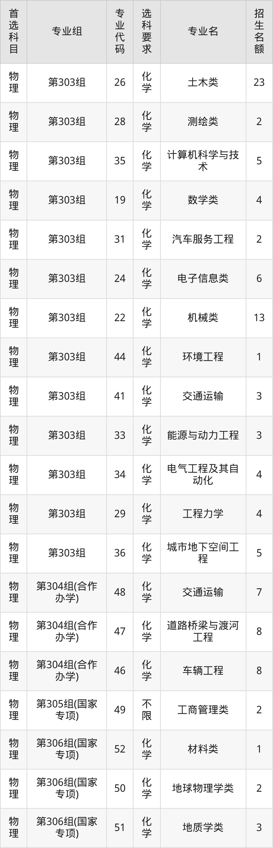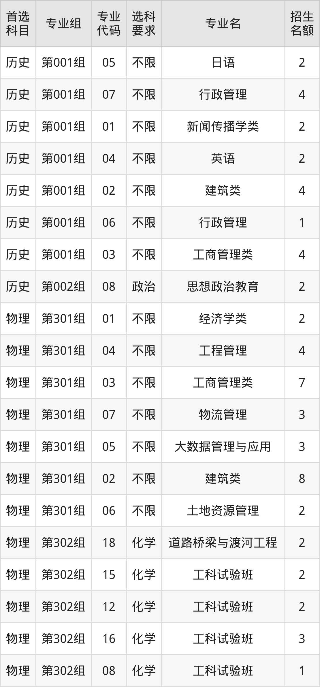 各专业选科要求、招生名额汇总如下: