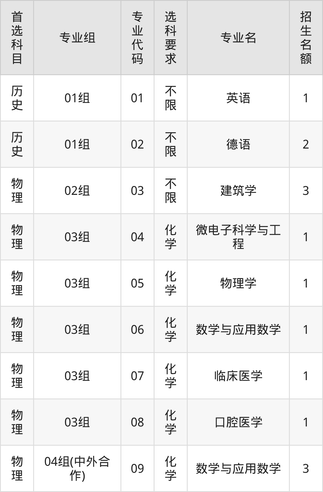 各专业选科要求、招生名额汇总如下: