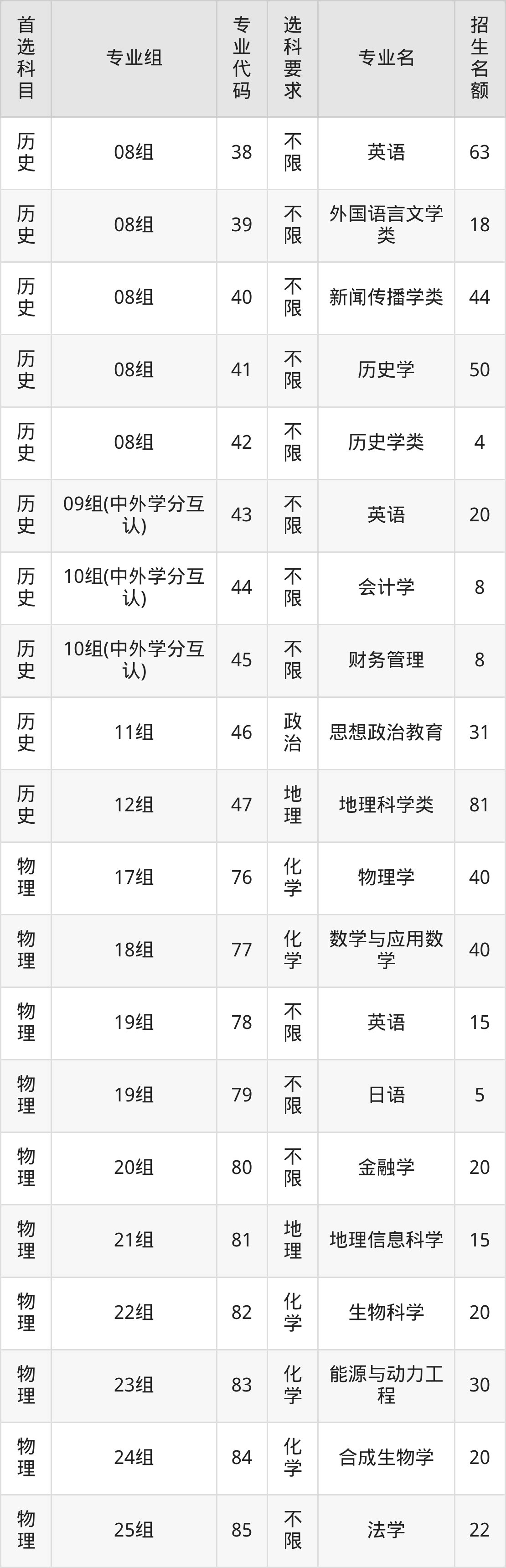 各专业选科要求、招生名额汇总如下: