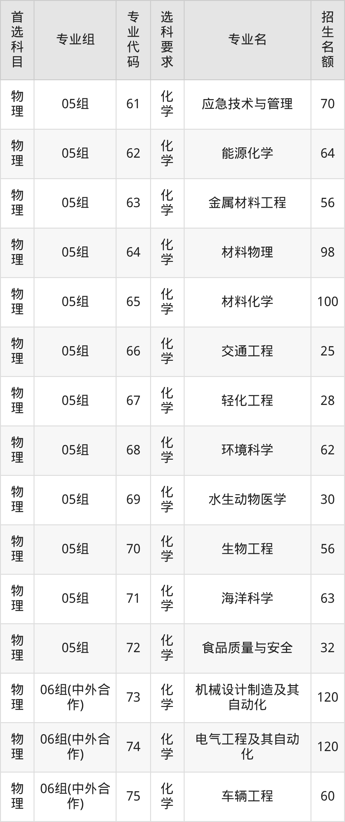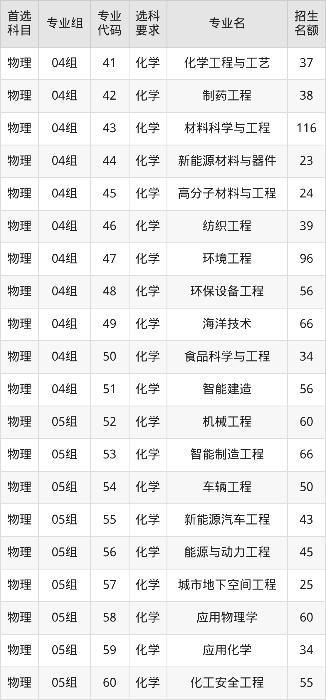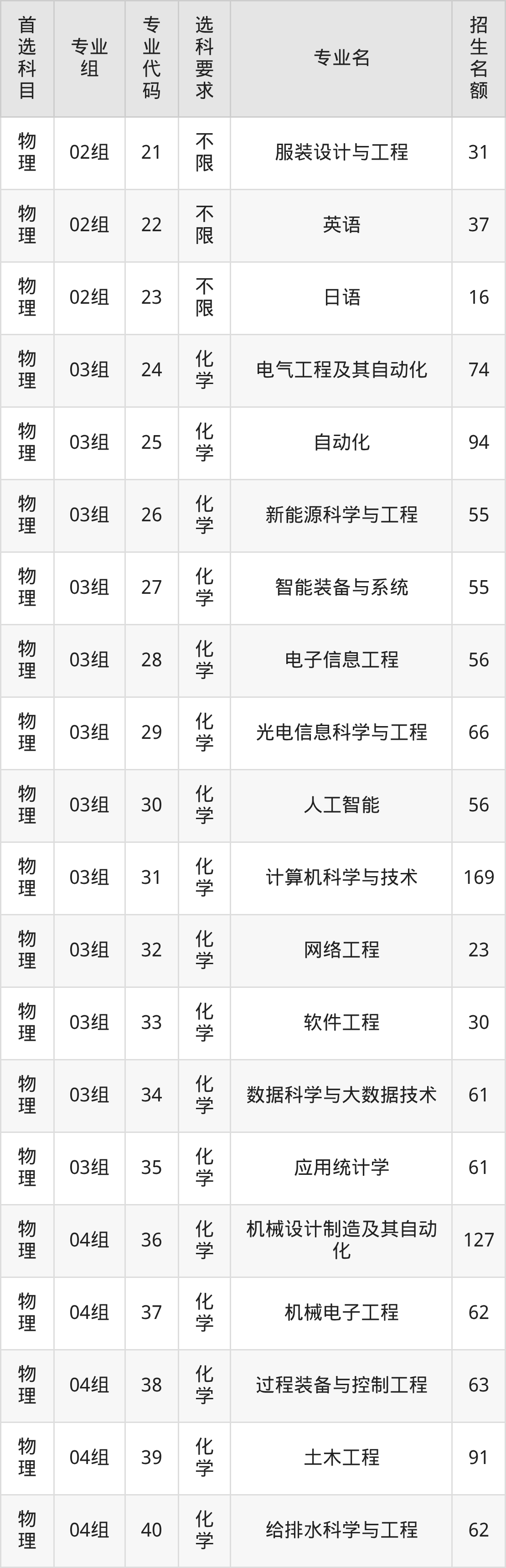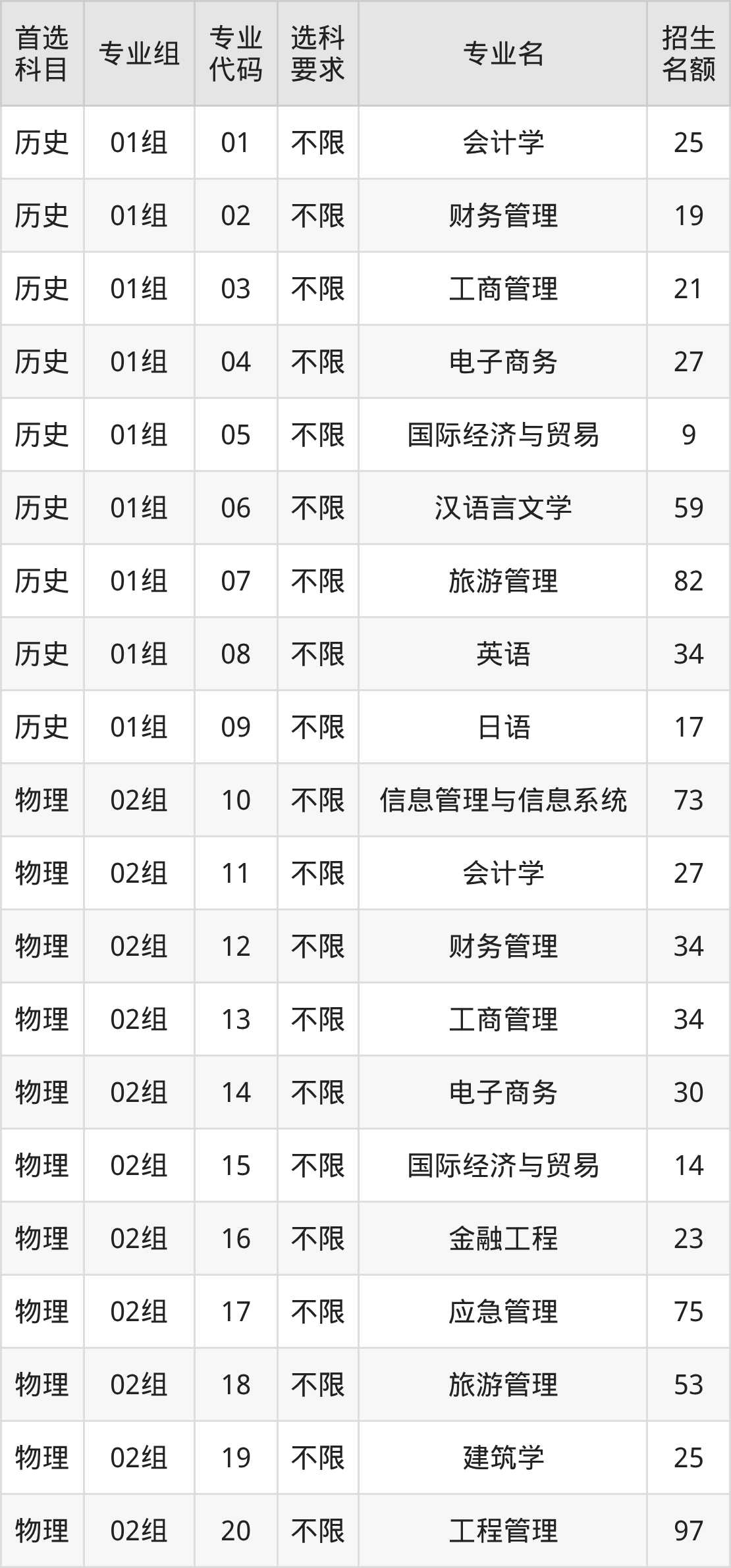 各专业选科要求、招生名额汇总如下: