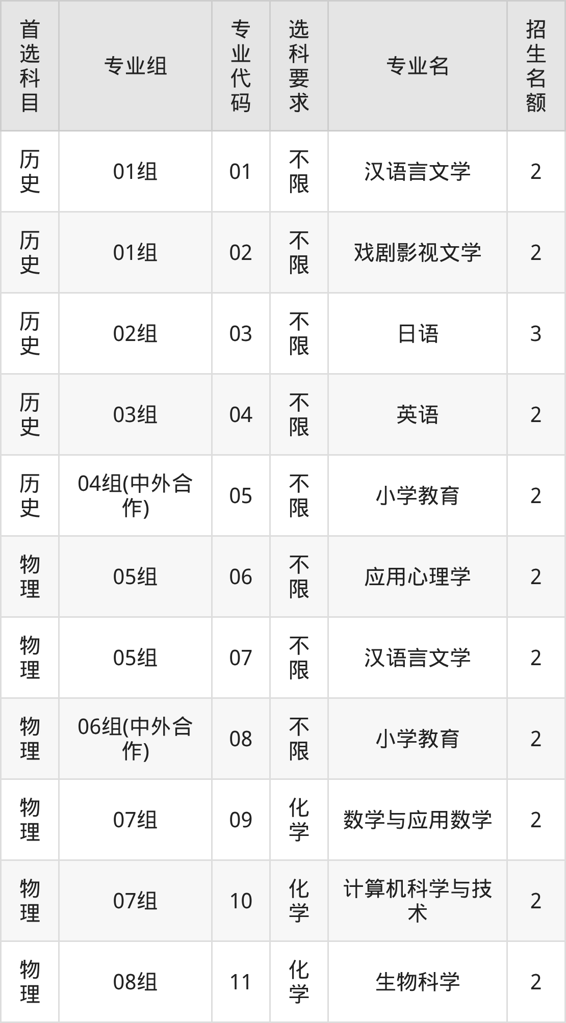 各专业选科要求、招生名额汇总如下: