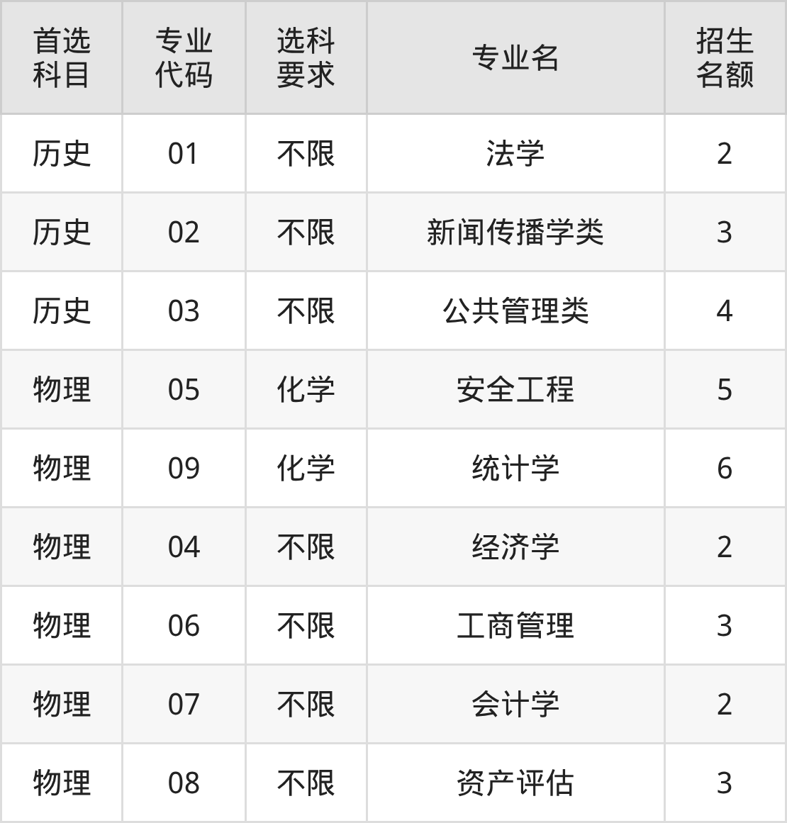 各专业选科要求、招生名额汇总如下: