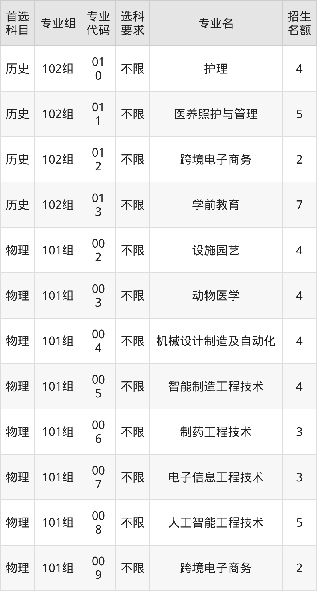 各专业选科要求、招生名额汇总如下: