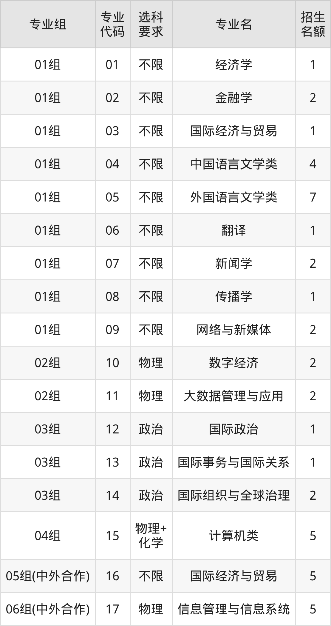 各专业选科要求、招生名额汇总如下: