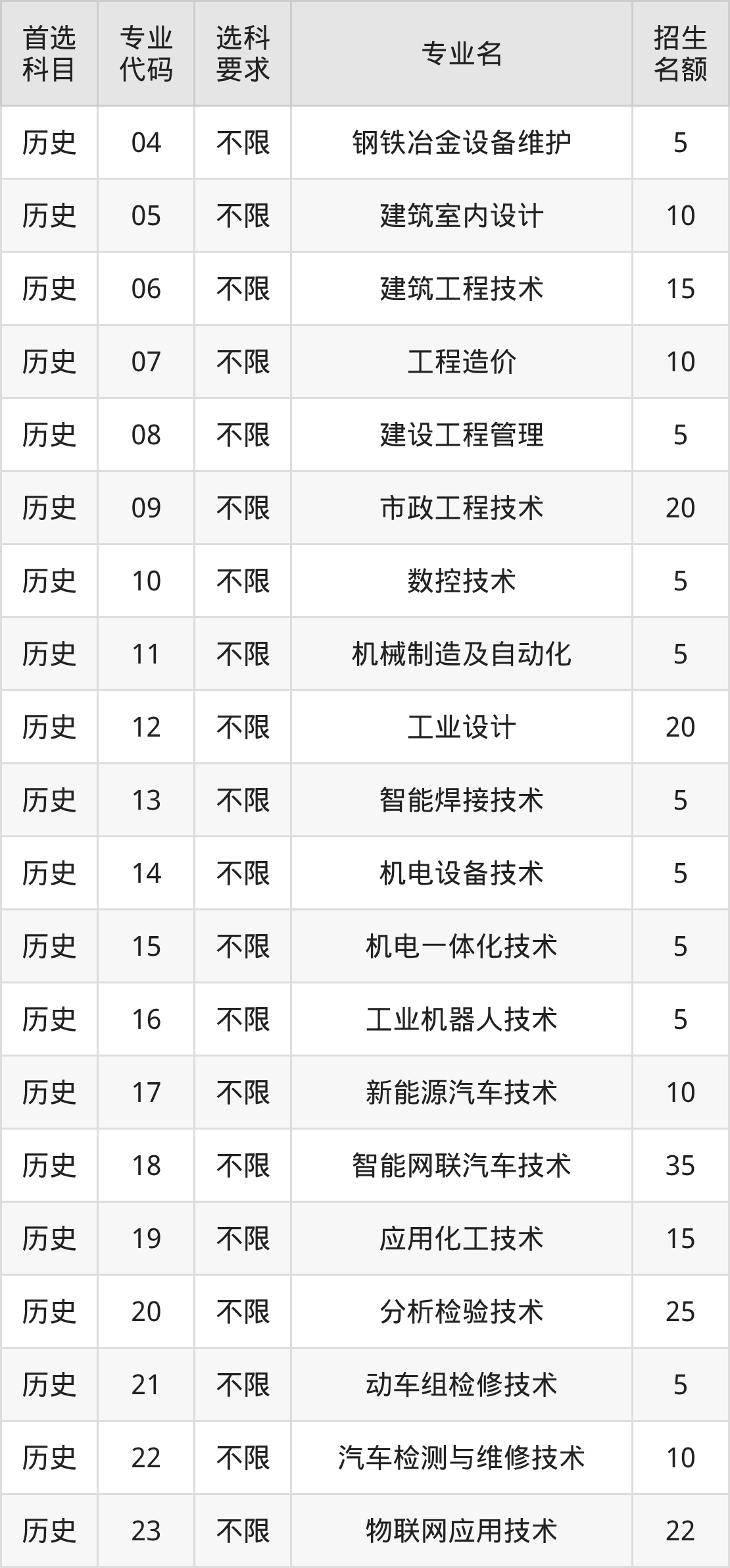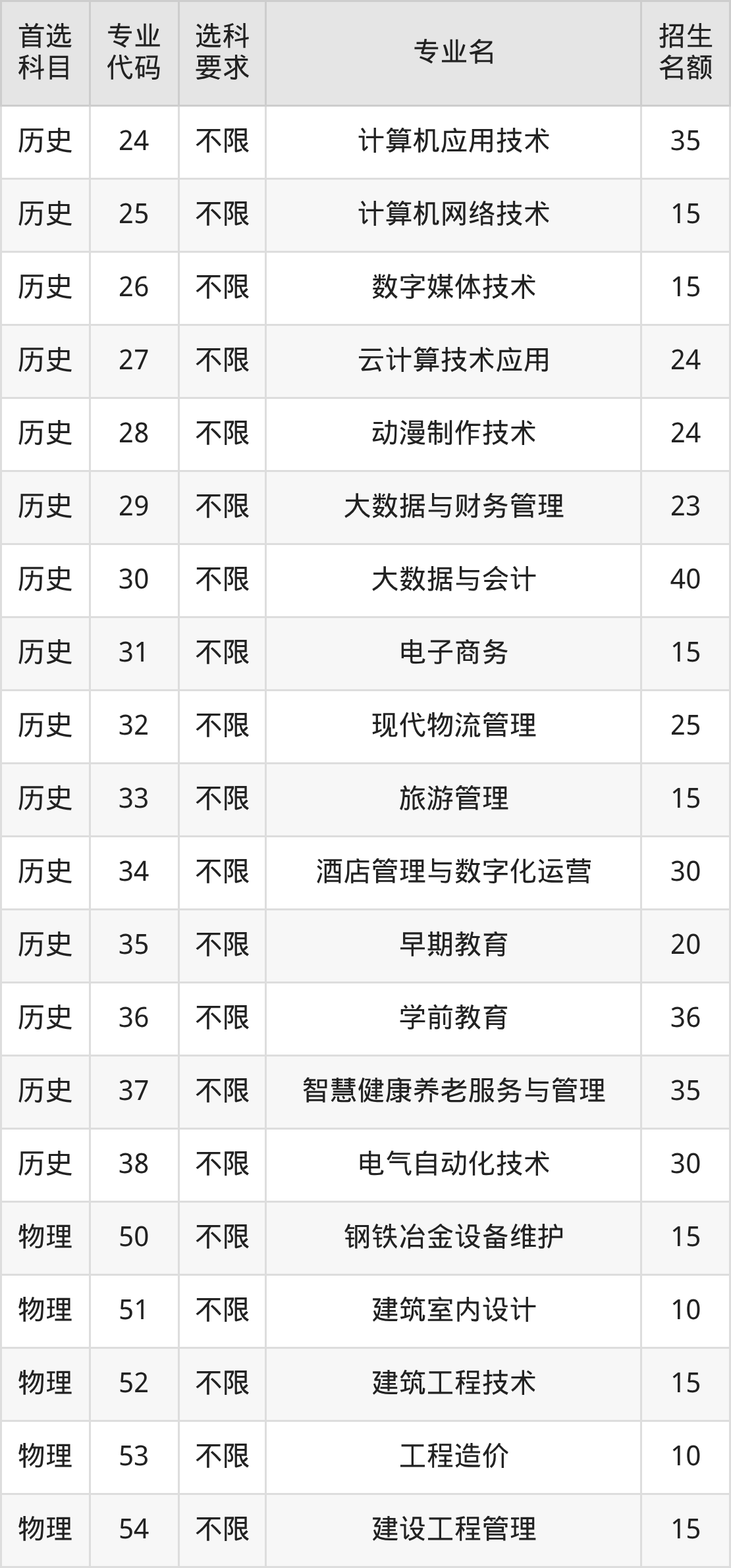 2025年唐山工业职业技术大学在河北省专科批招生中,总计划人数为1633人,招生专业有35个,包括钢铁冶金设备维护(20人)、建筑室内设计(20人)、建筑工程技术(30人)、工程造价(20人)等。其中电气自动化技术为中外合作办学,学费是18000元/年。
