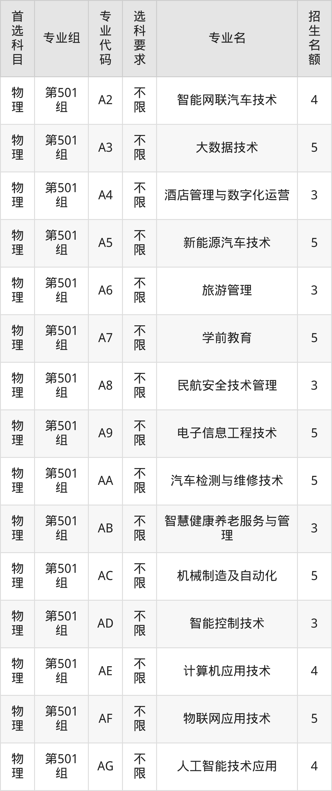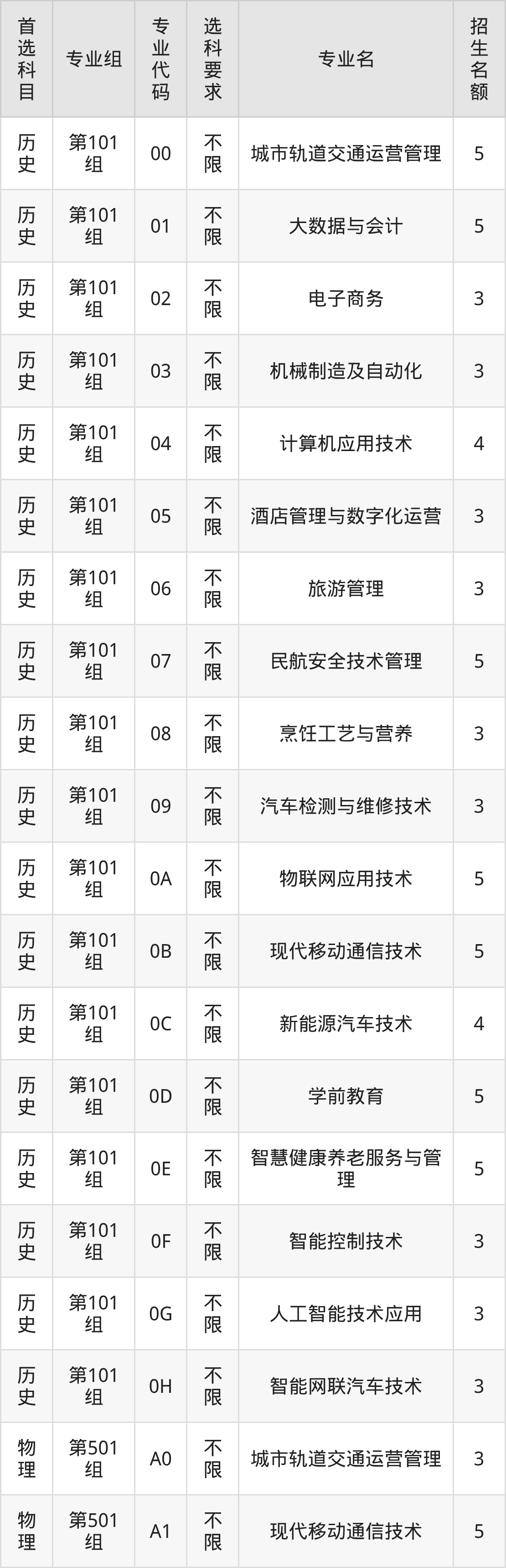 各专业选科要求、招生名额汇总如下: