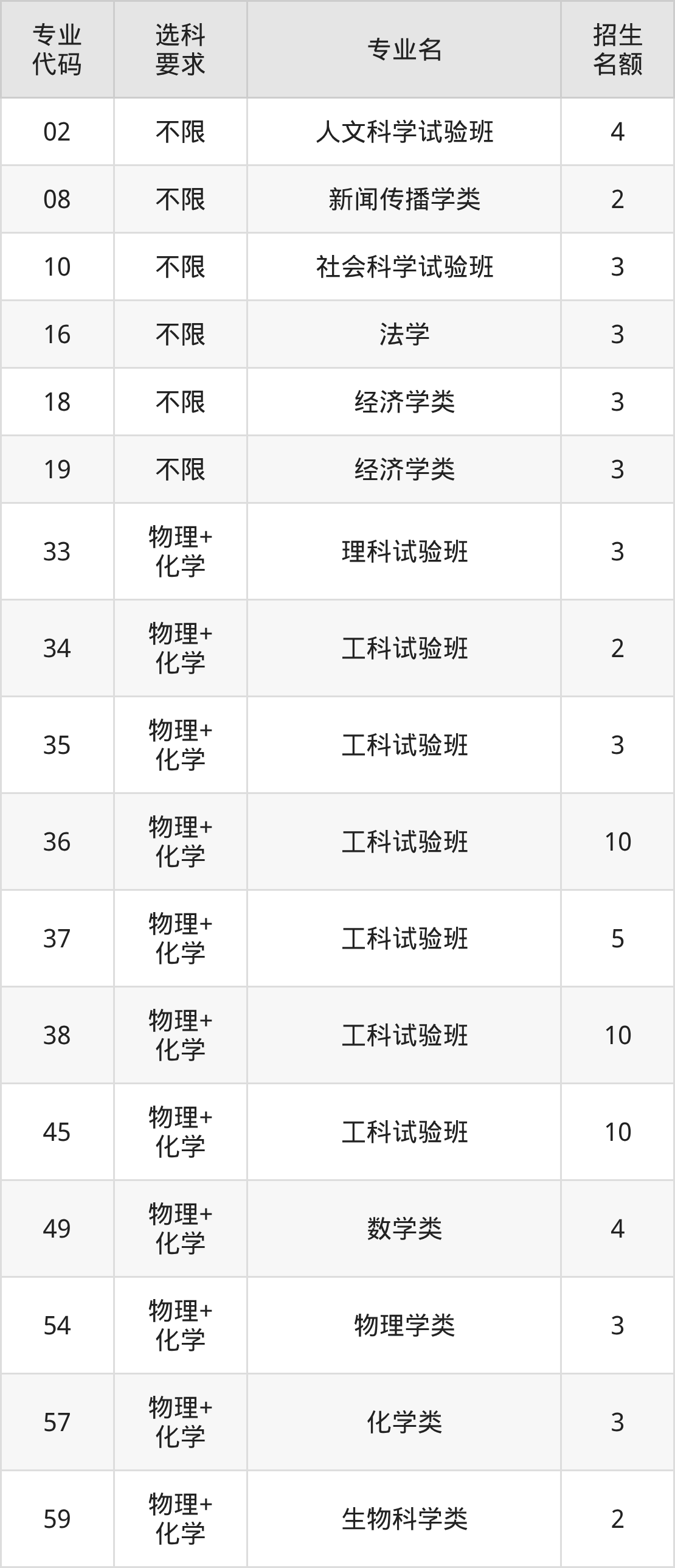 各专业选科要求、招生名额汇总如下: