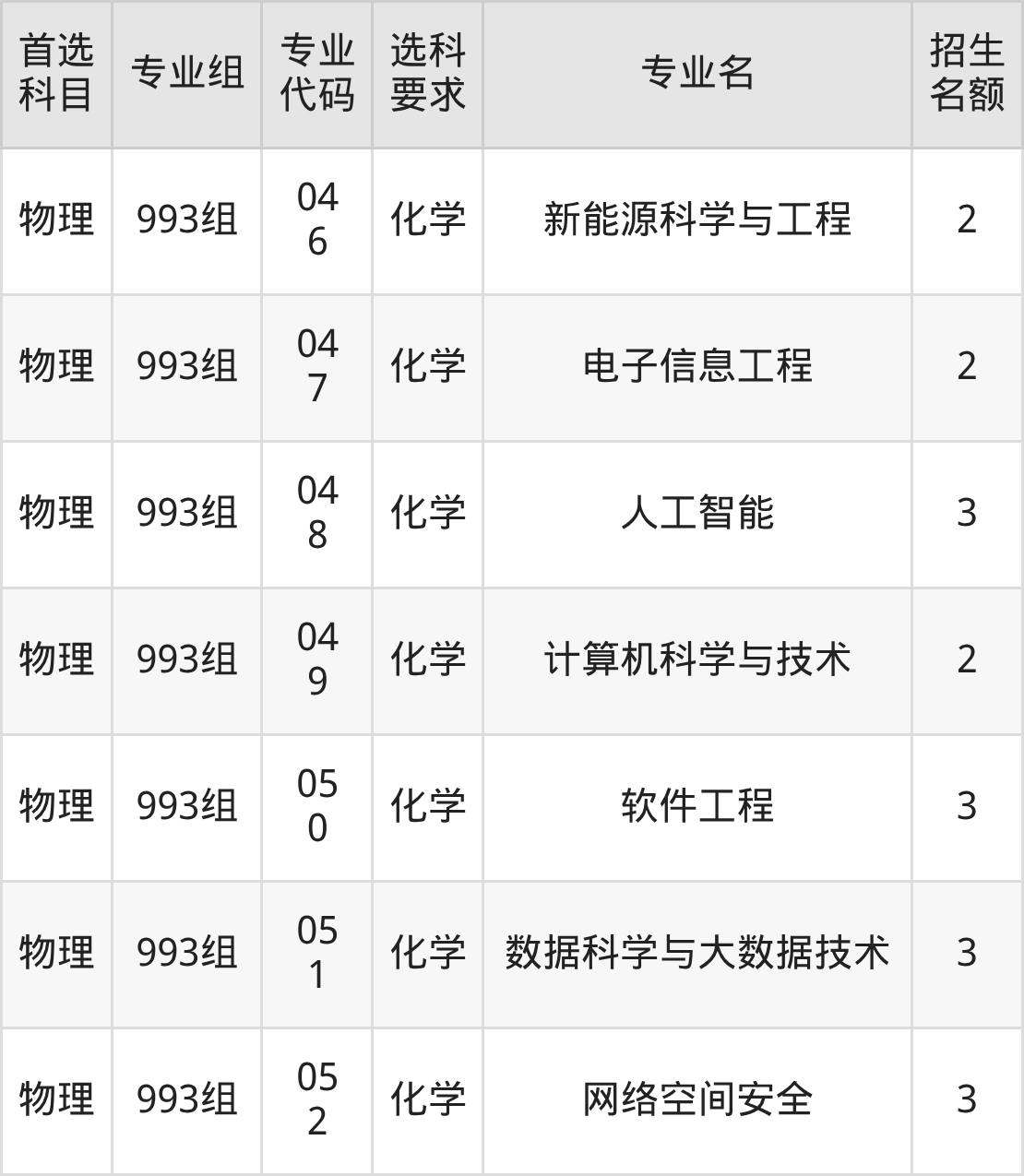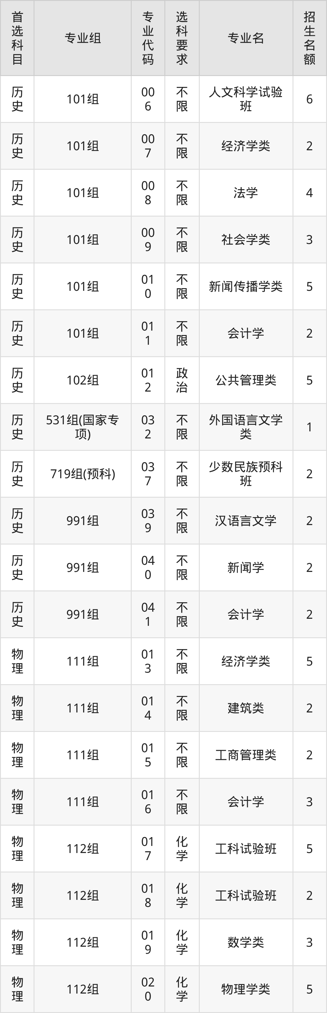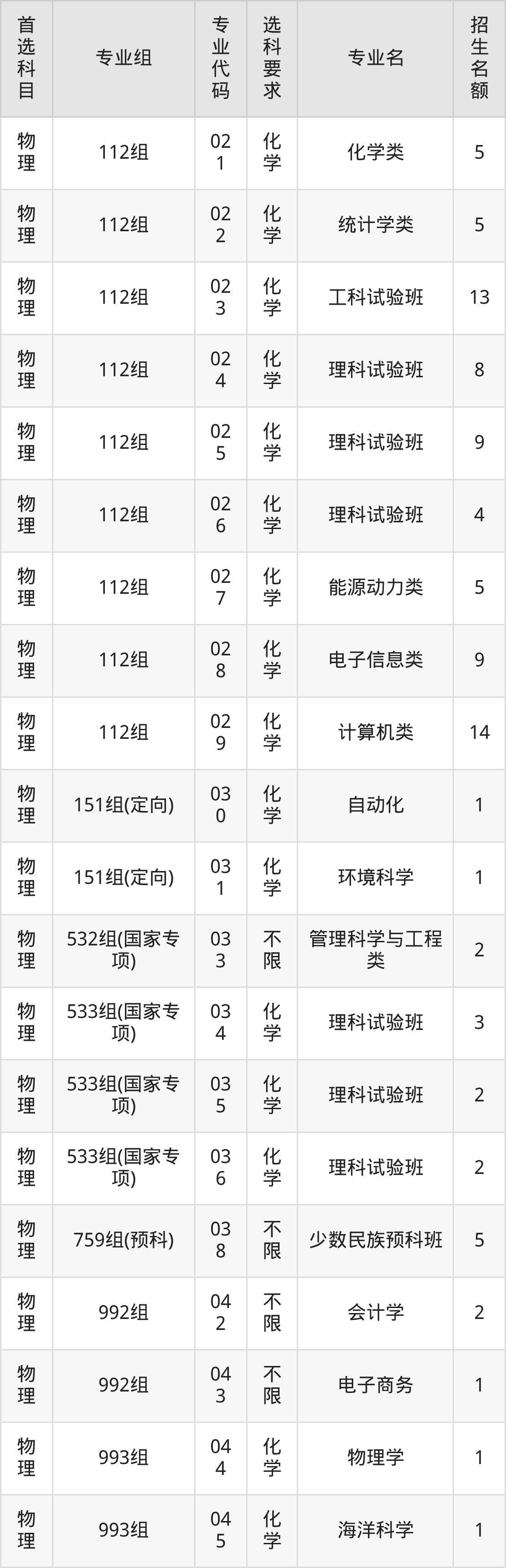 各专业选科要求、招生名额汇总如下: