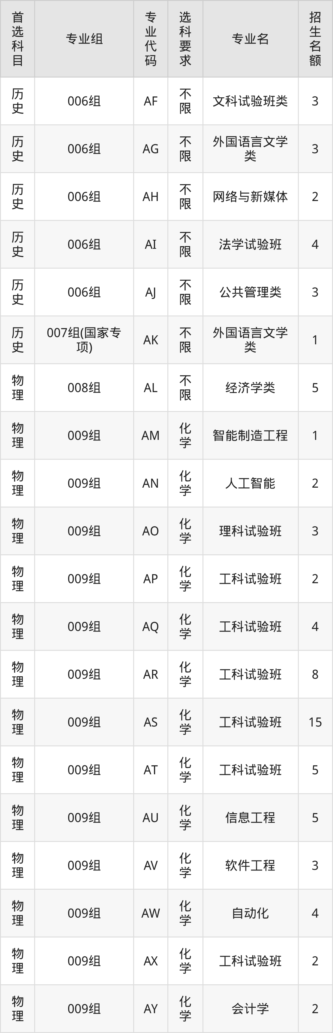 各专业选科要求、招生名额汇总如下: