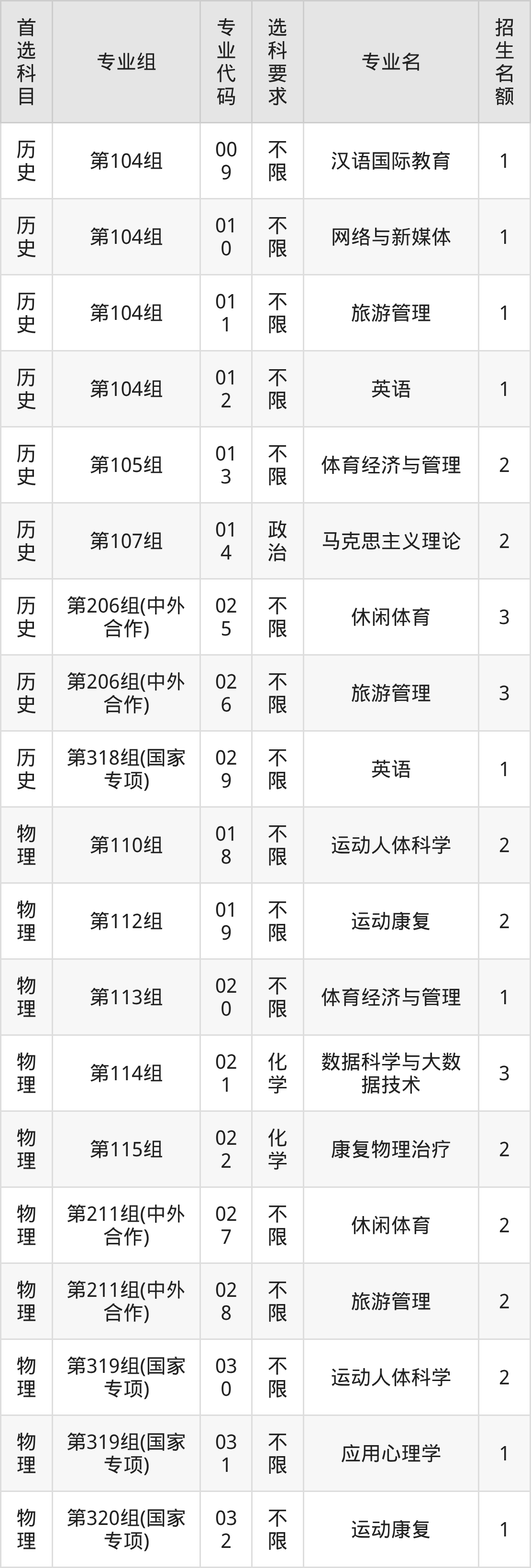 二、北京体育大学在湖南招生计划及专业