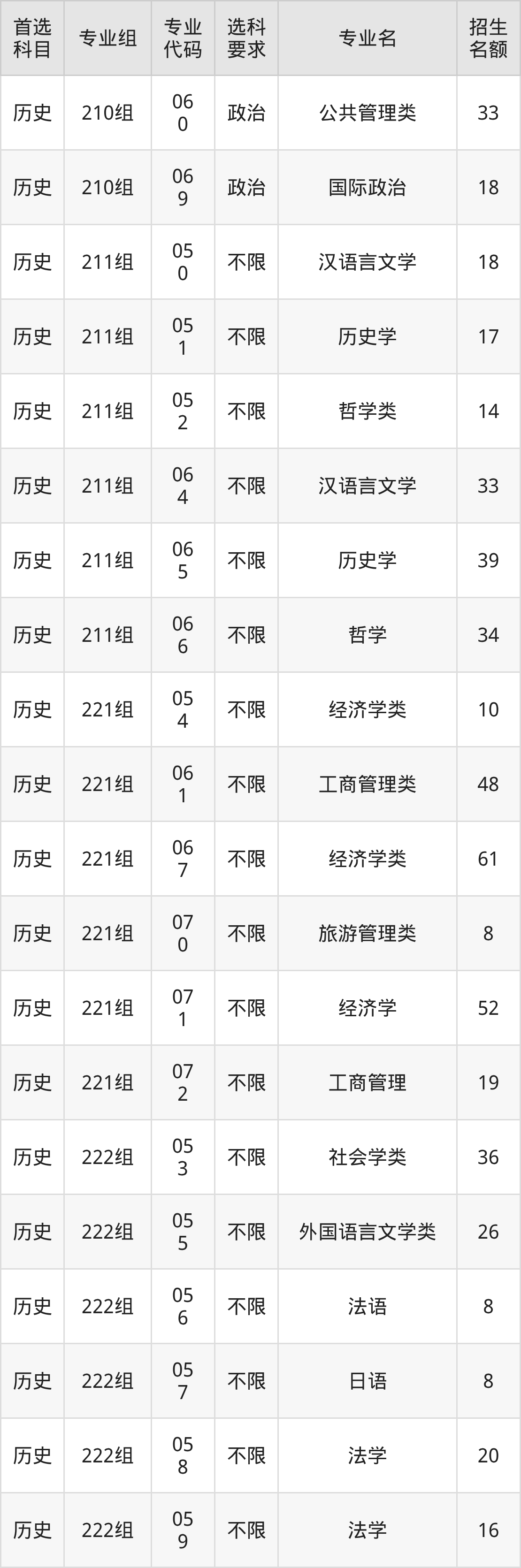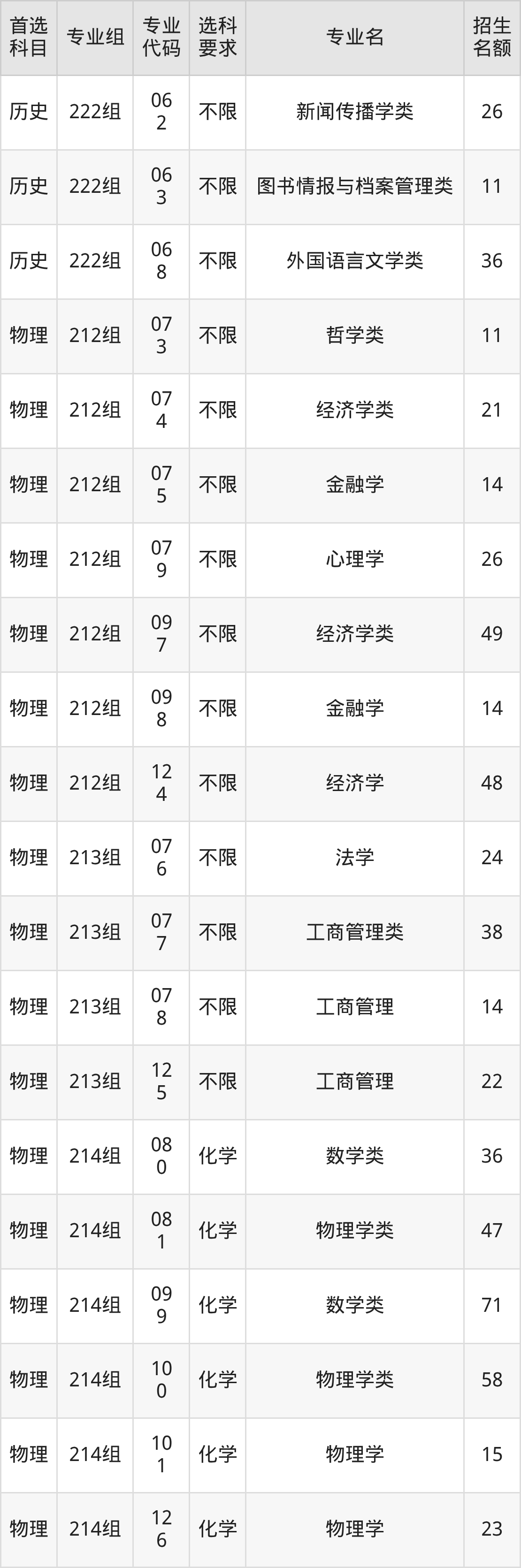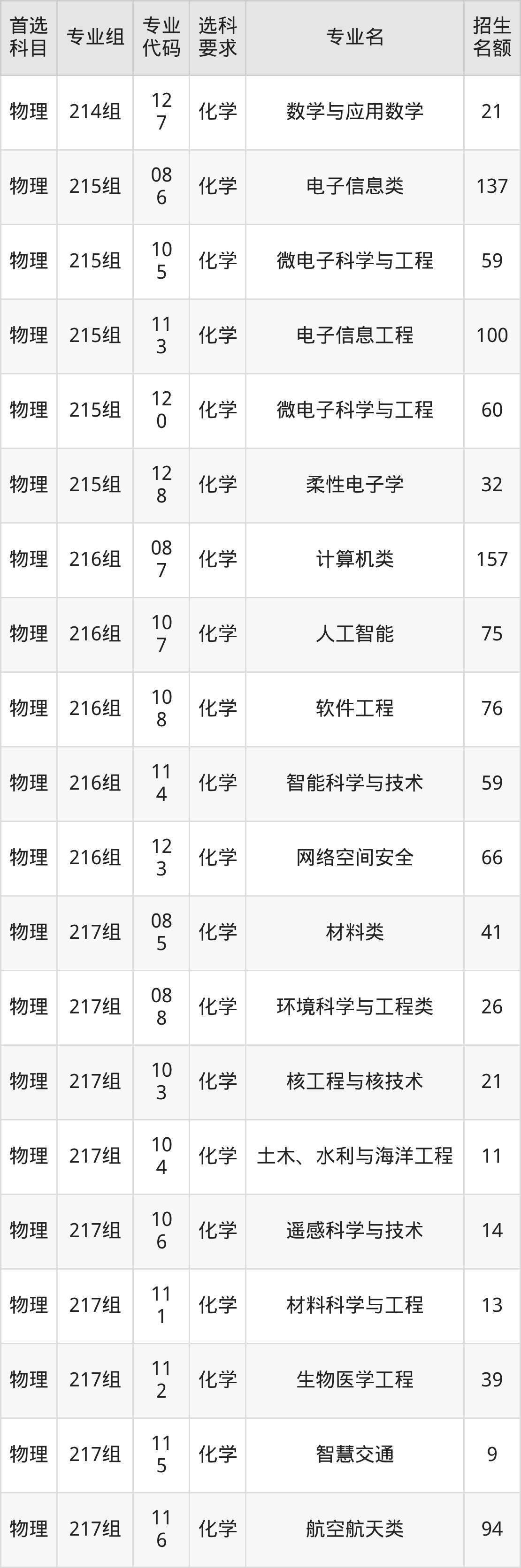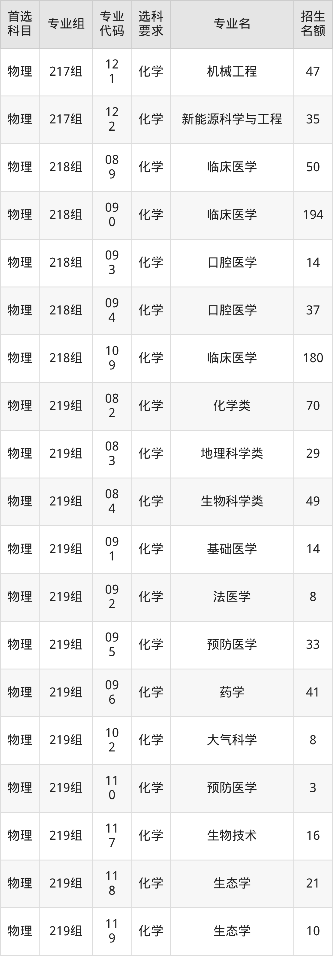 各专业选科要求、招生名额汇总如下: