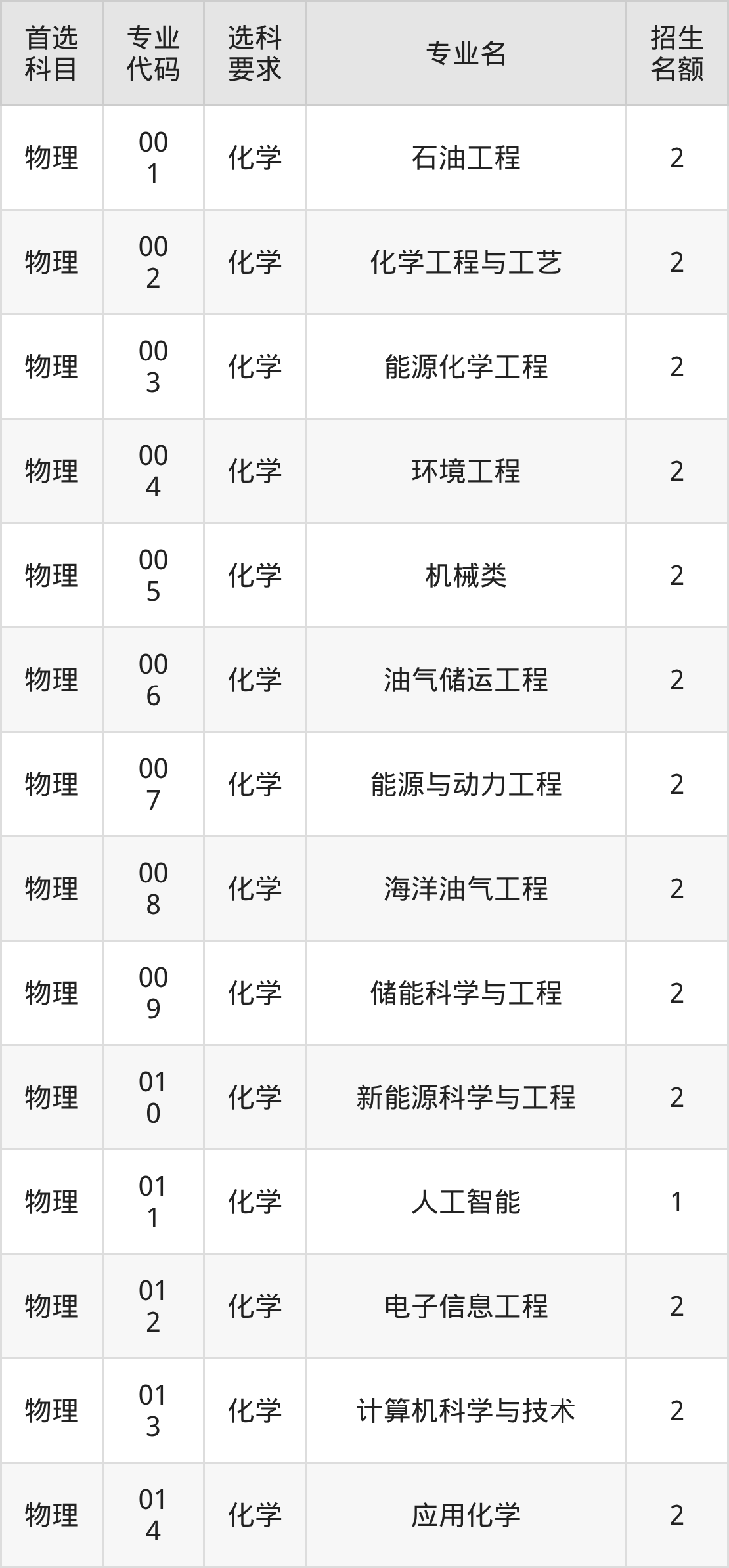2025年中国石油大学(北京)在广东省本科批招生中,总计划人数为27人,招生专业有14个,包括石油工程(2人)、化学工程与工艺(2人)、能源化学工程(2人)、环境工程(2人)等。