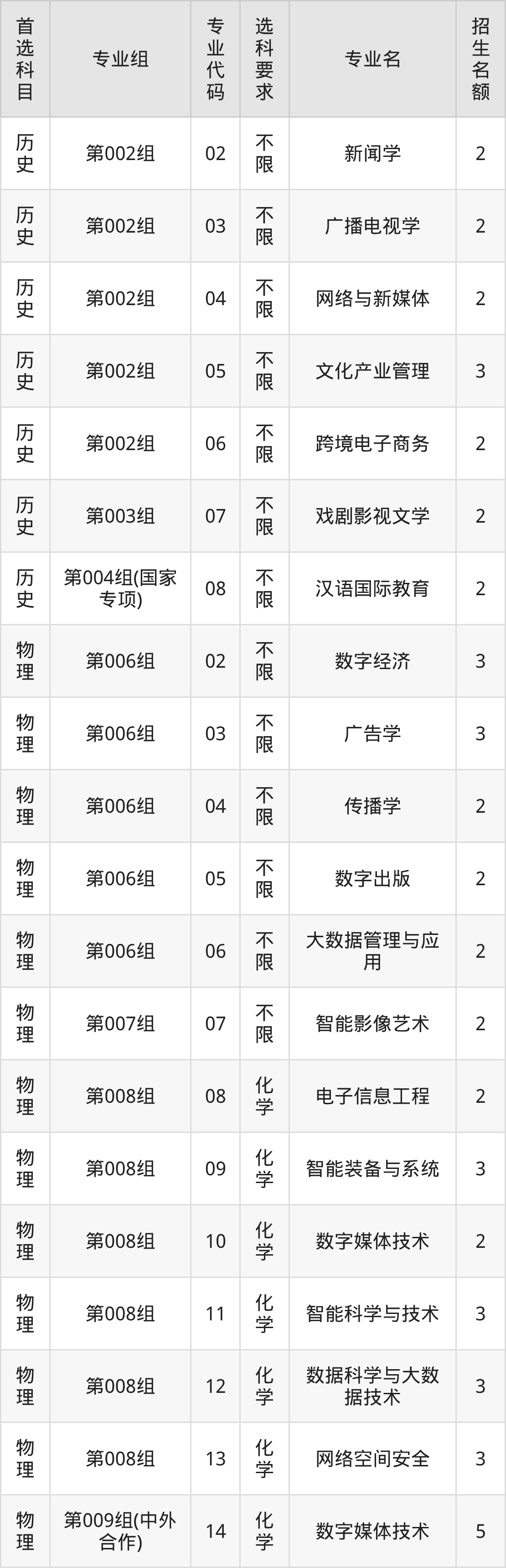 2025年中国传媒大学在黑龙江省本科批招生中,总计划人数为55人,招生专业有20个,包括新闻学(2人)、广播电视学(2人)、网络与新媒体(2人)、文化产业管理(3人)等。其中数字媒体技术、智能科学与技术为中外合作办学,学费均是100000元/年。