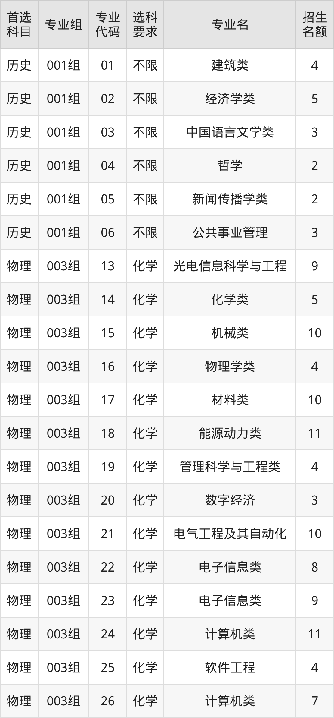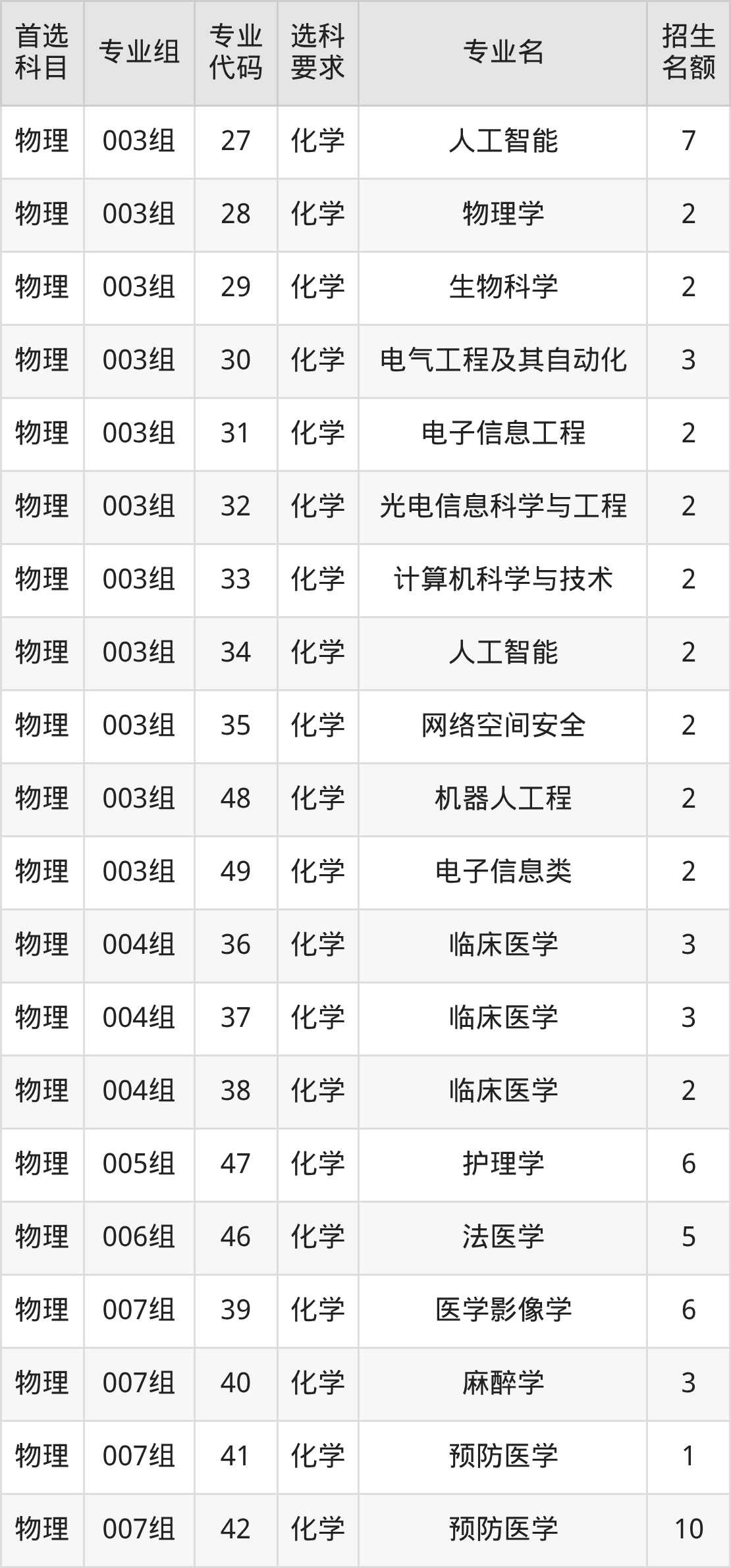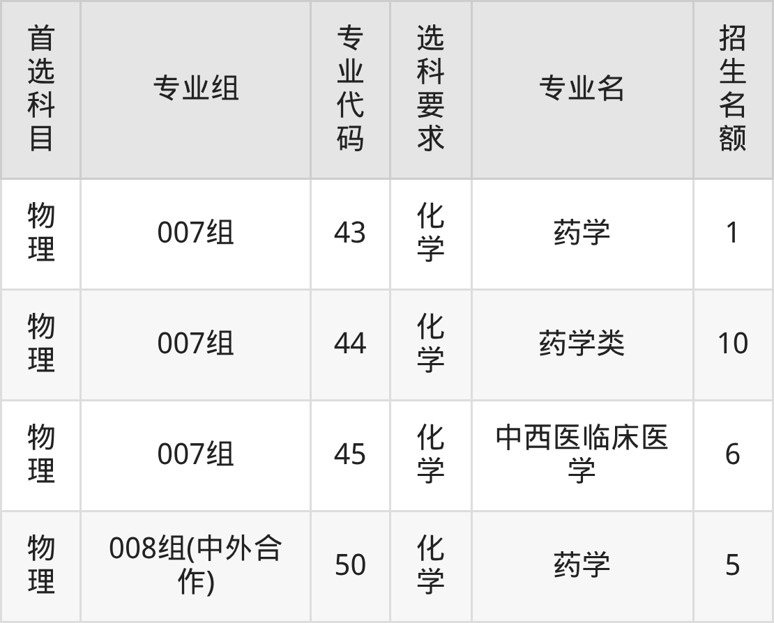 各专业选科要求、招生名额汇总如下: