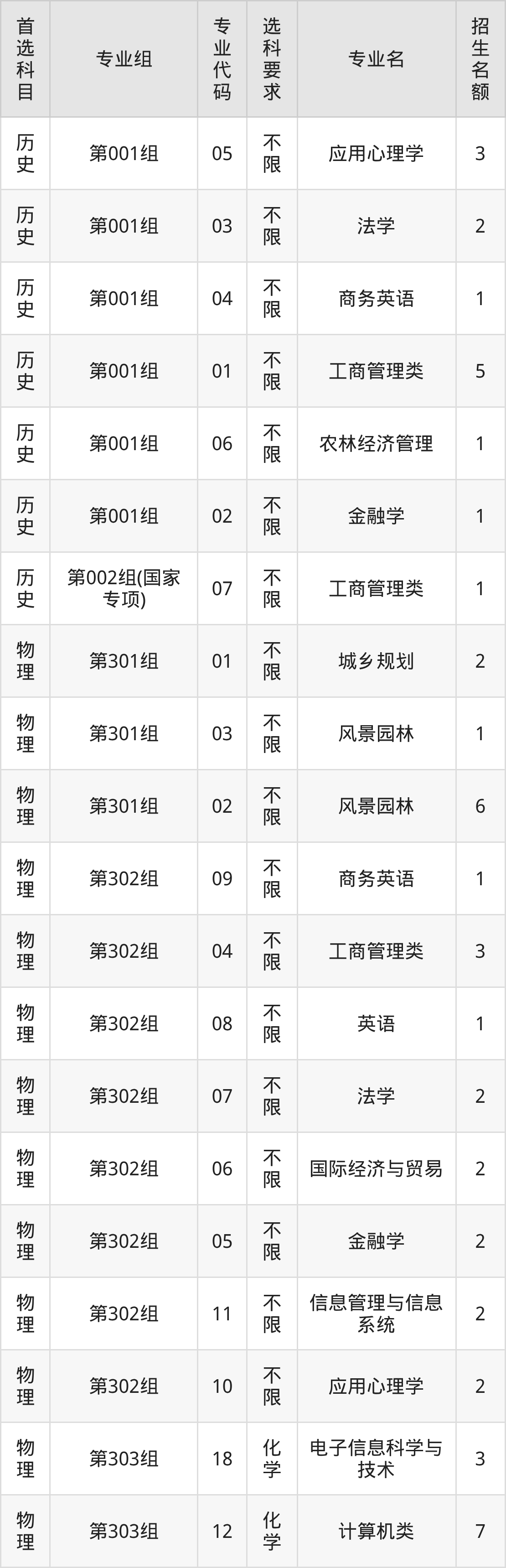 各专业选科要求、招生名额汇总如下: