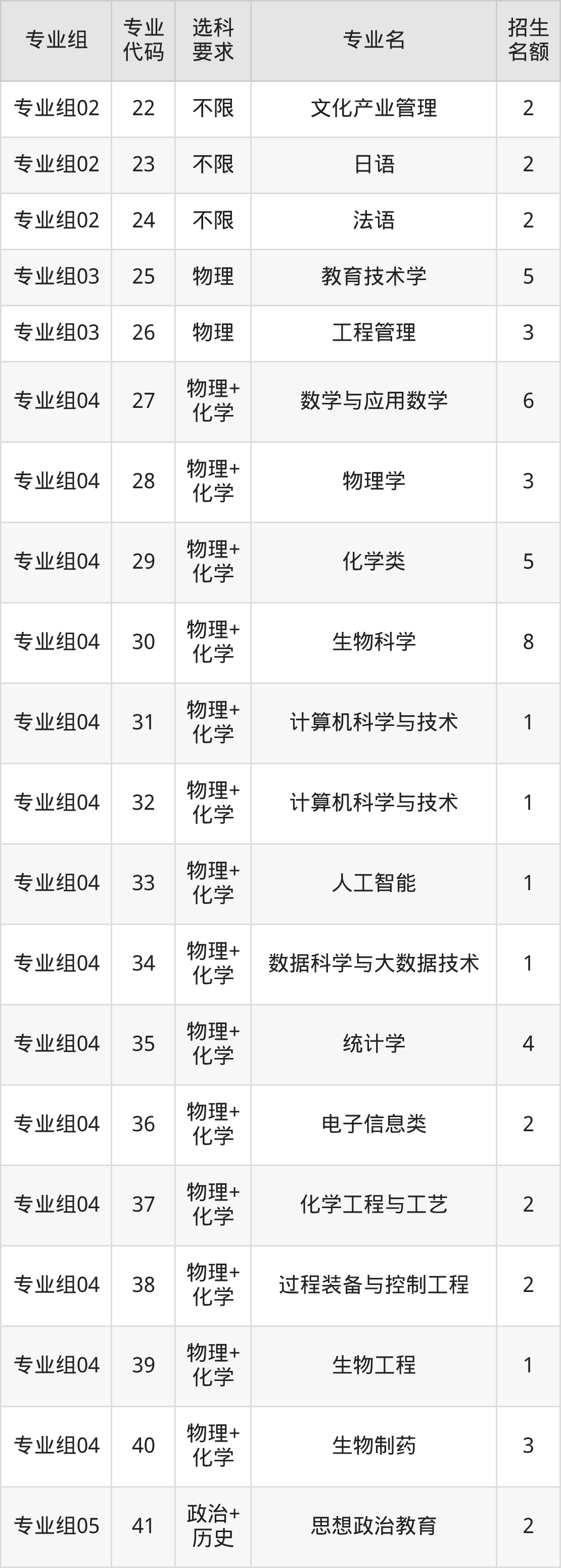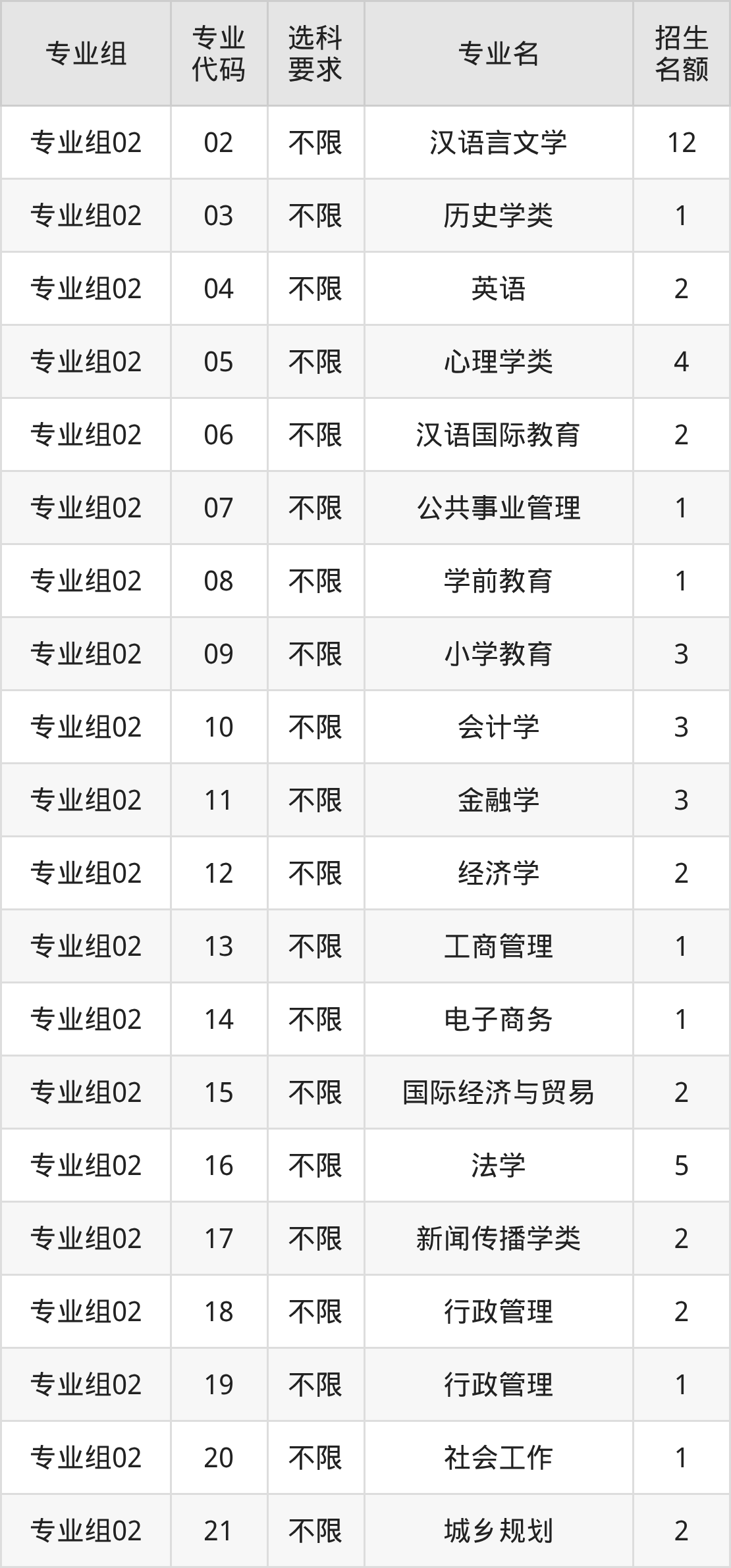 2025年江西师范大学在海南省本科批招生中,总计划人数为114人,招生专业有39个,包括汉语言文学(12人)、历史学类(1人)、英语(2人)、心理学类(4人)等。