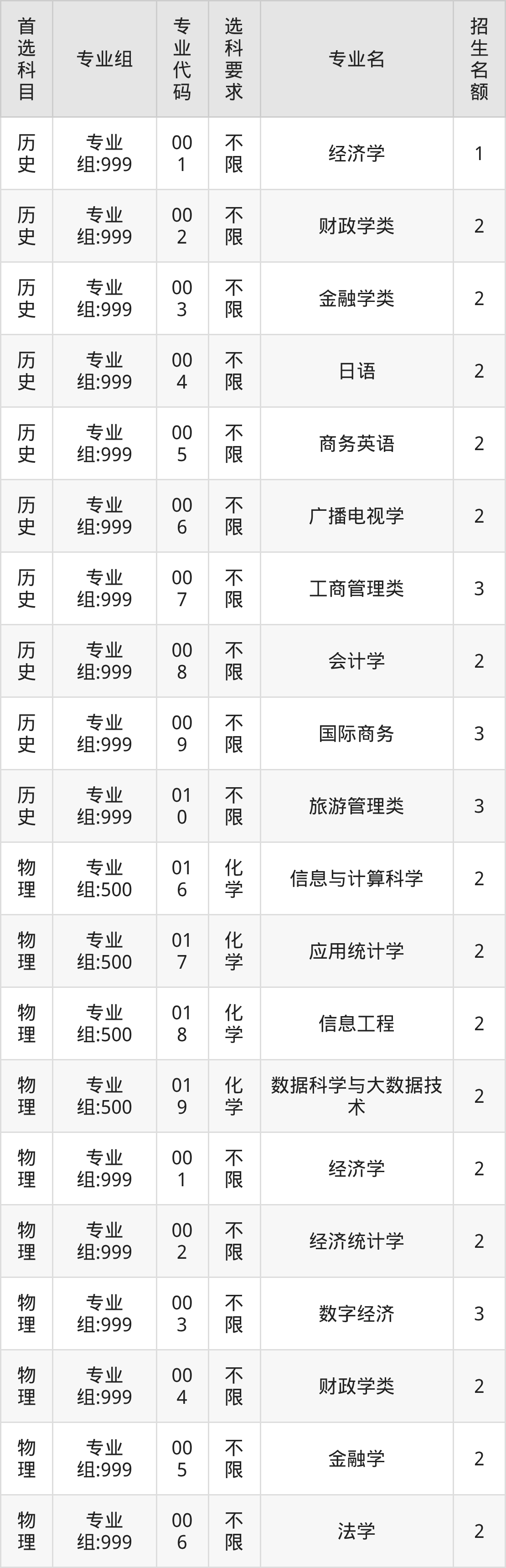 各专业选科要求、招生名额汇总如下: