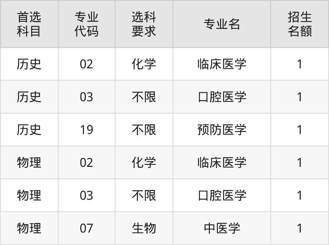 各专业选科要求、招生名额汇总如下: