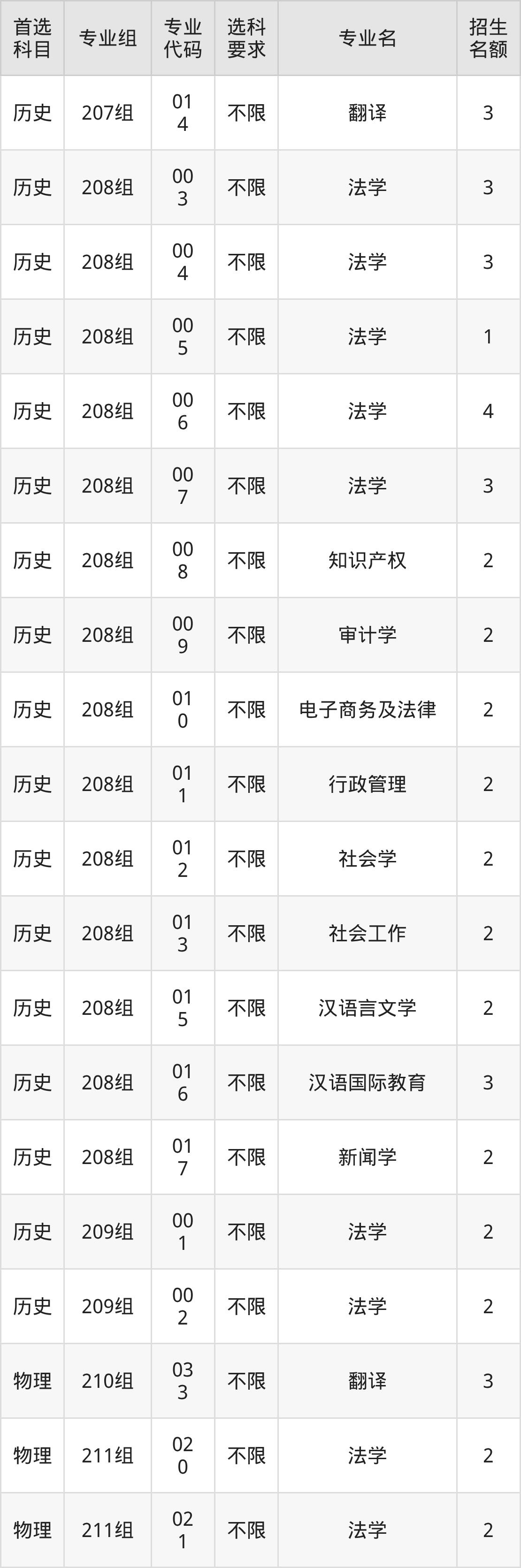 2025年上海政法学院在广东省本科批招生中,总计划人数为75人,招生专业有14个,包括翻译(6人)、法学(34人)、知识产权(4人)、审计学(5人)等。