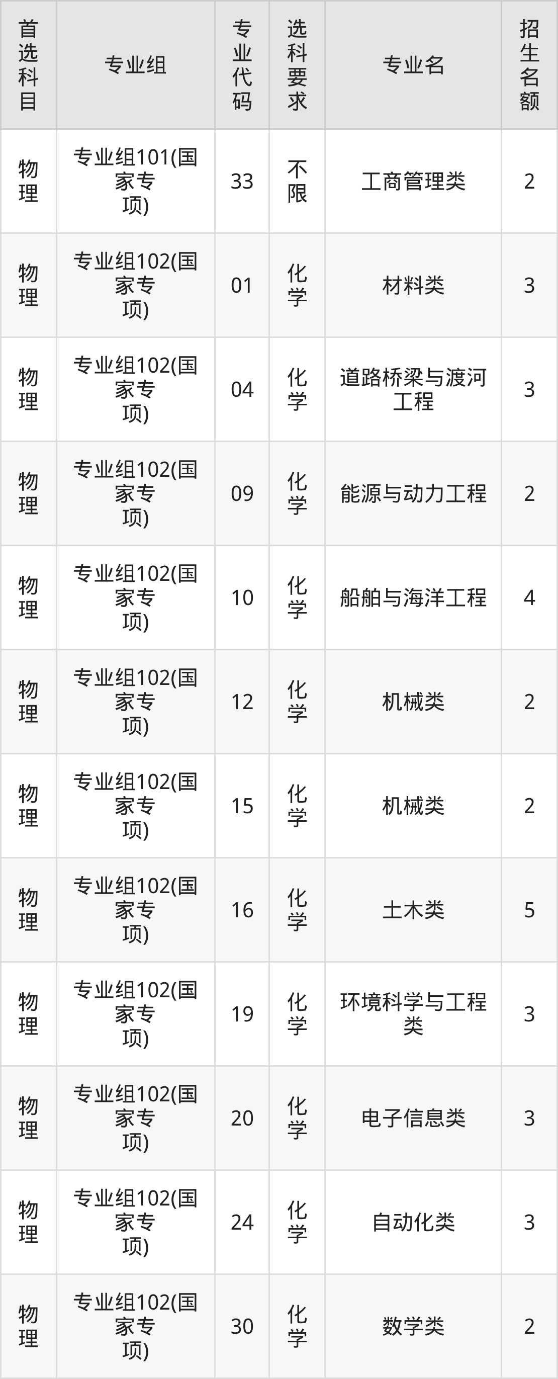 2025年武汉理工大学在四川省本科批A段(国家专项)招生中,总计划人数为34人,招生专业有11个,包括工商管理类(2人)、材料类(3人)、道路桥梁与渡河工程(3人)、能源与动力工程(2人)等。
