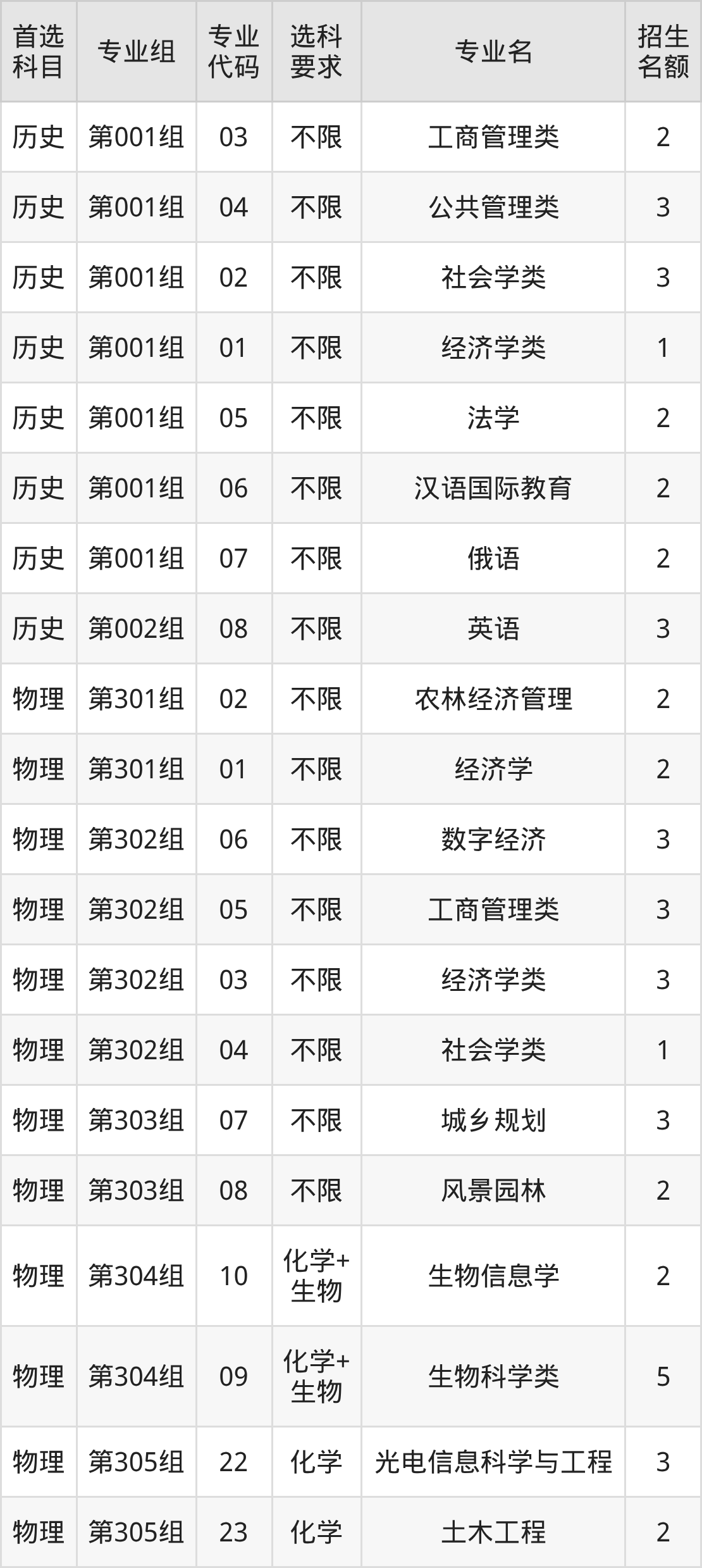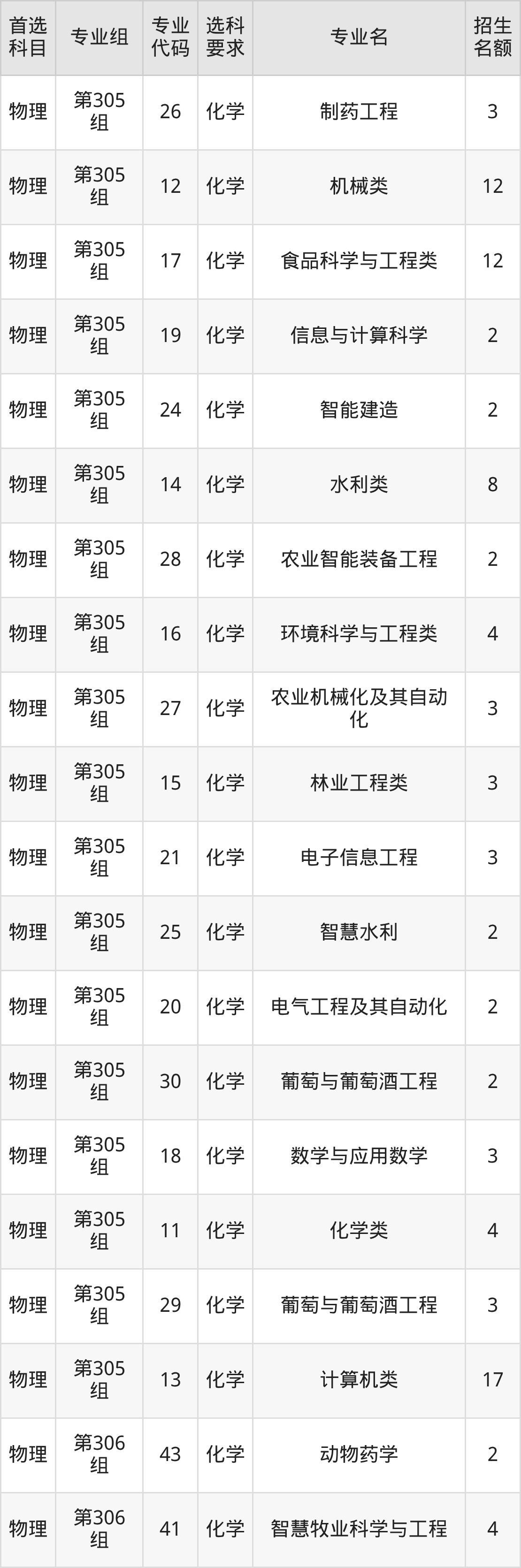 各专业选科要求、招生名额汇总如下:
